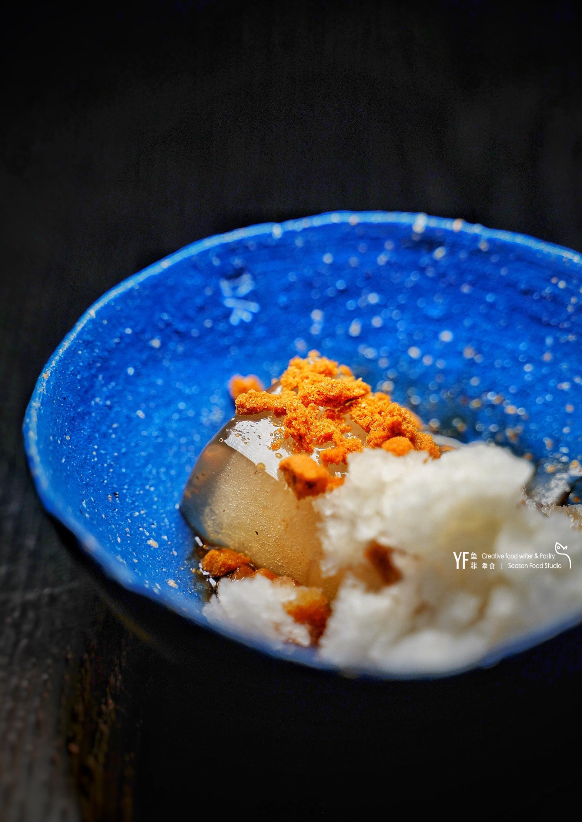 用昆布包裹的四川雅安鱼子酱,入口深海咸鲜味比较浓郁,配上无花果脆片,随着咀嚼后呈现出淡淡的回甘。