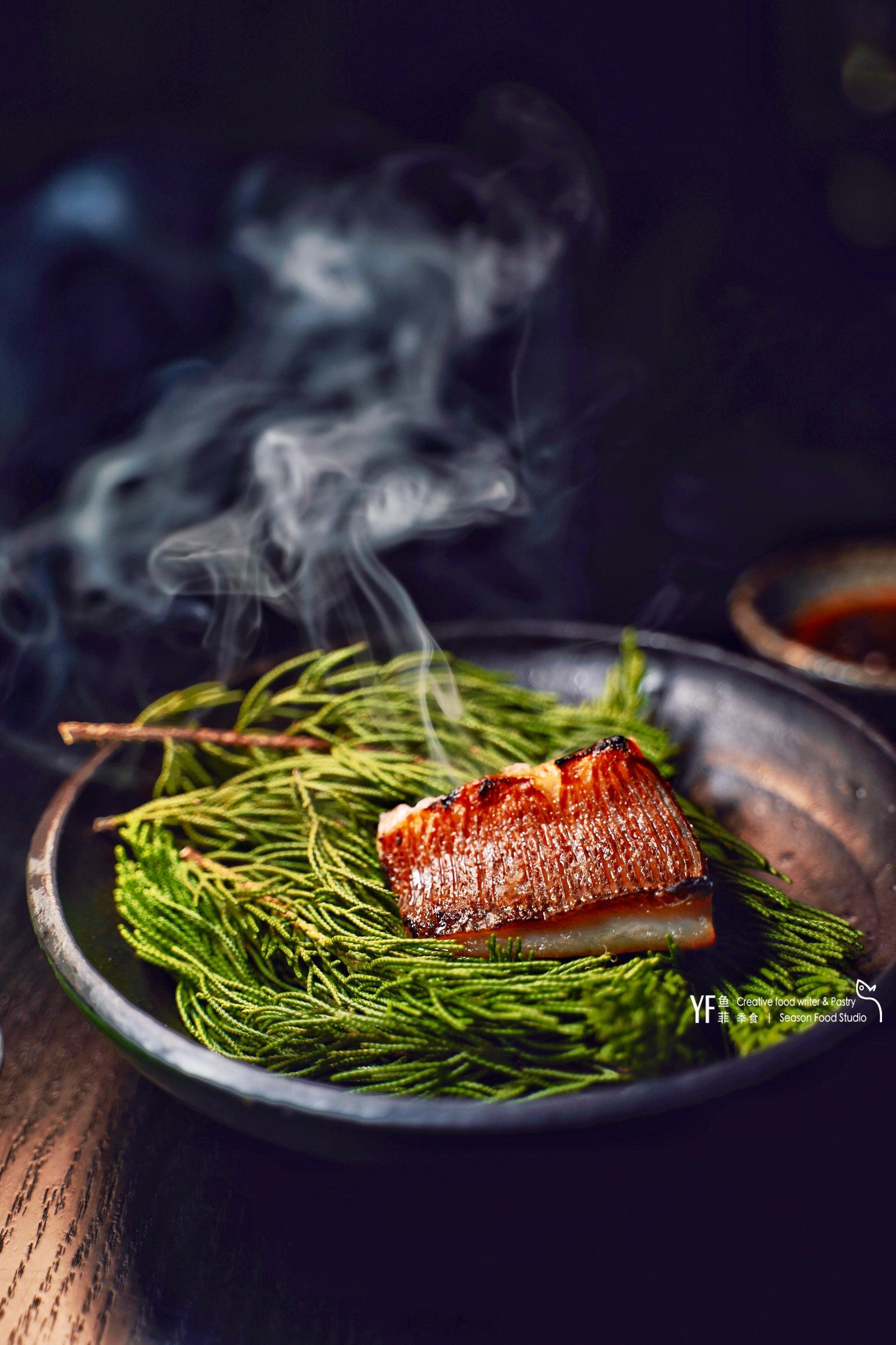 仪式感比较强的一道菜,取新鲜松树松节,炙烤后香气浓而不烈,有种稳重的气息氤氲餐桌。马友鱼直接吃,鱼皮薄脆,鱼肉吃起来有一种很嫩的鸡肉质感。淋上特制的蘸碟,油润感提升很多,以及复合香料将鱼肉丰腴感都带出来,人间值得。
