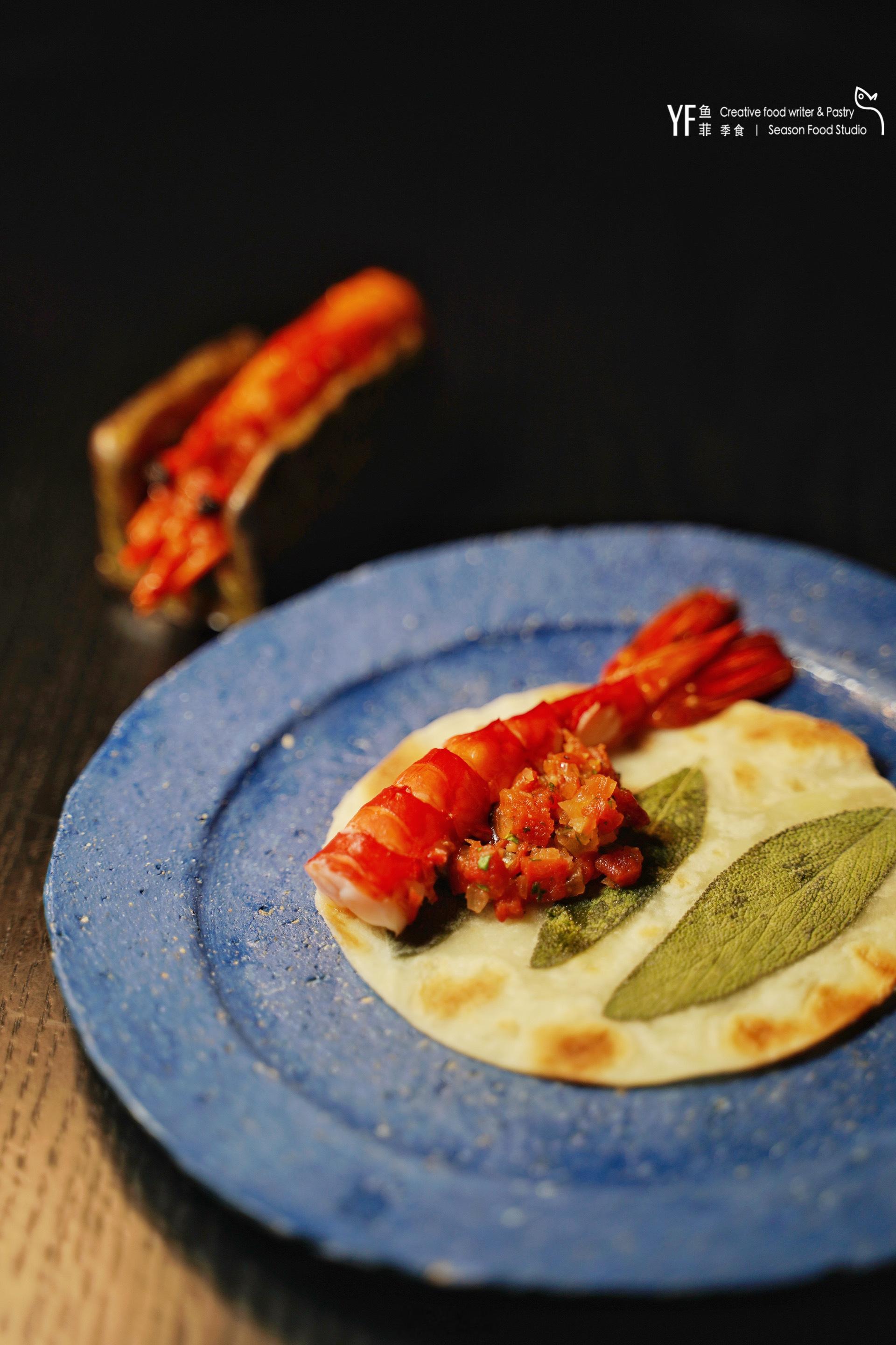 用东海红虾做成虾身薄片,酱馅料卷挟,虾肉甜糯,里面氤氲着淡淡的辣味来自腌渍过的花菜杆,清脆透辣,以及风干番茄的微酸,非常开胃,惊喜!