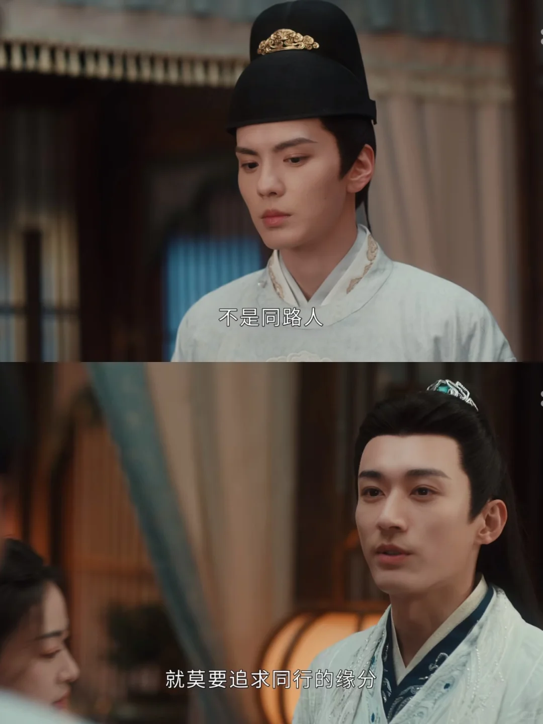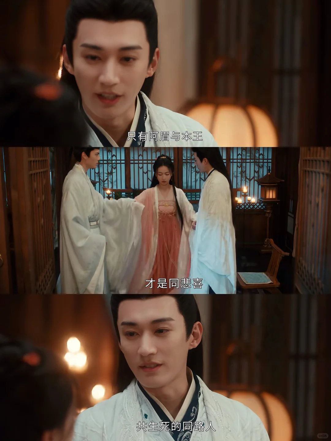 人的感情很微妙。如果你不喜欢一个人,恐怕连让对方说出那句“生日快乐”的机会都不会给,如果你喜欢一个人,每天都是风和日暖,天天都有过生日的好心情。越秦要给眉林过生日,送这个又送那个,眉林那句“今天不是我的生辰”固然是实话,但也是在划清界限。她在等那个特定的人来,那个特定的人来得刚好,他今日尤为俊美,往日头发总有几缕发须垂落,今日全部束了上去。他说话腔调依然有几分慢几分懒,但字句中是不容挑战的果断:“不是同路人,就莫要追求同行的缘分,只有阿眉与本王,才是同悲喜、共生死的同路人。”换句话说,越秦,陪她过生日是我的分内之事,你越界了。
