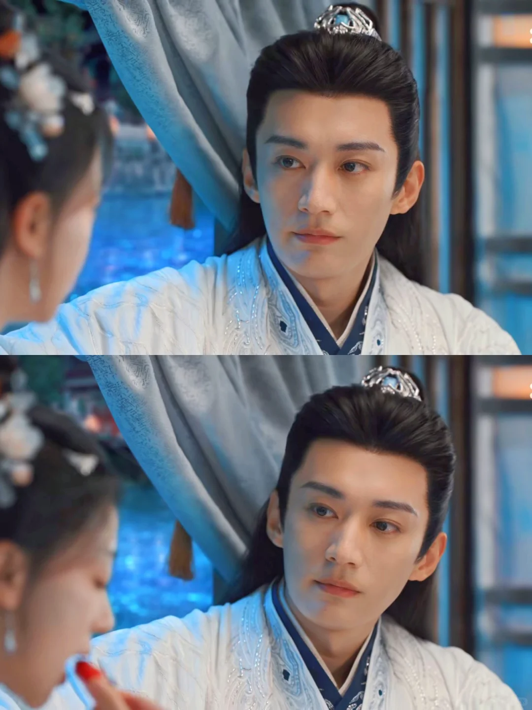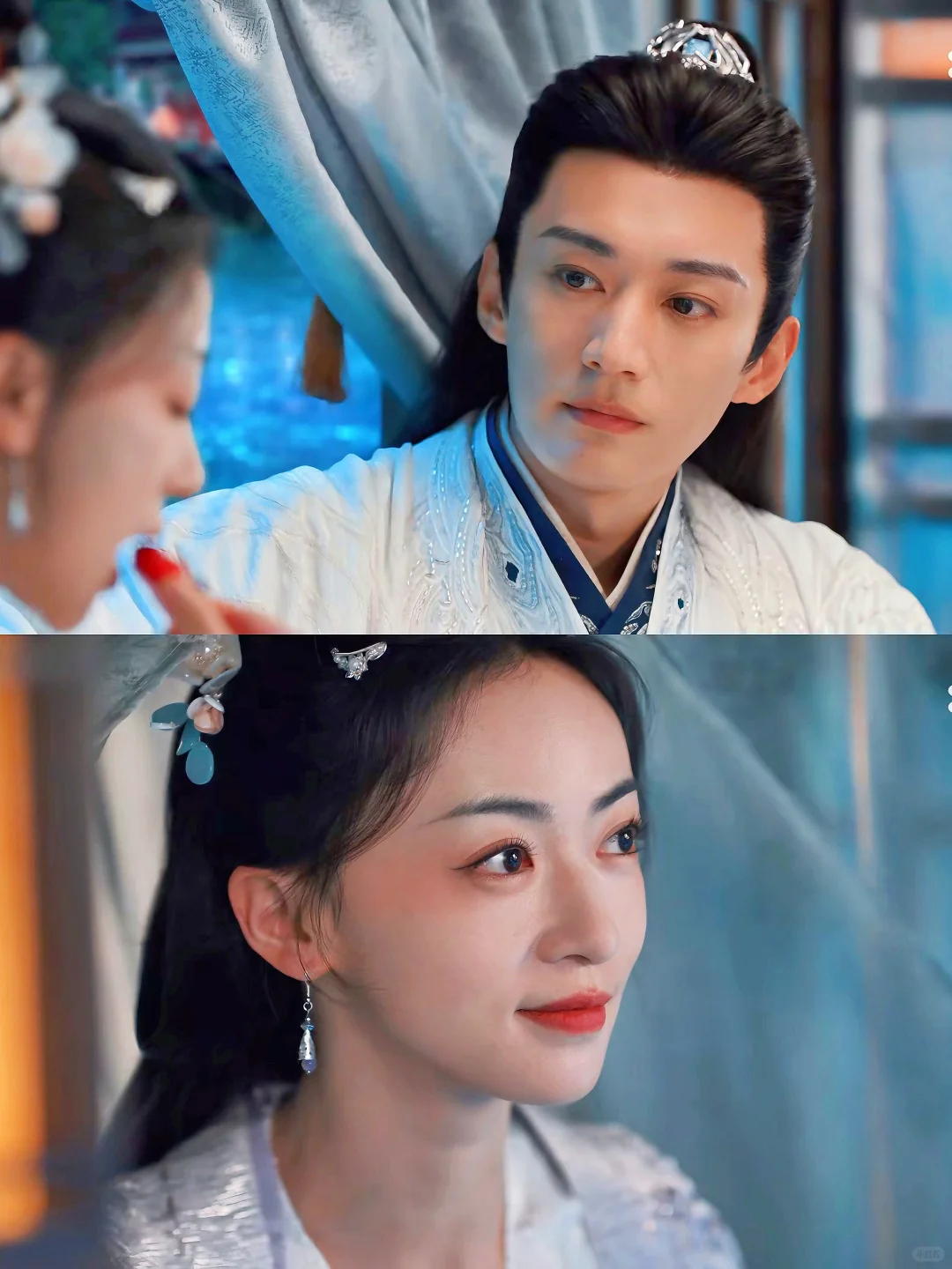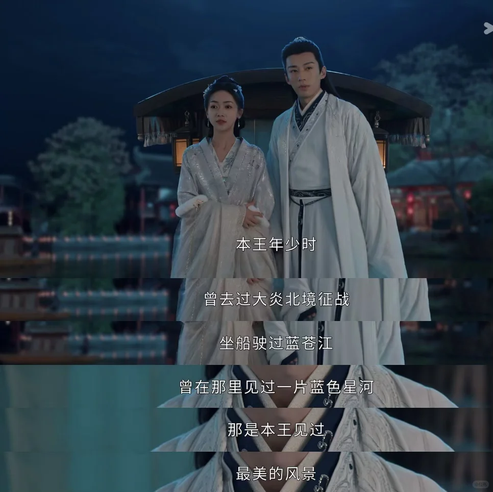 征战四方的将军,什么样的美景没见过,大漠孤烟,长河落日,月明羌笛,风满关山……看得太多,反而慎于分享,因为真正的共鸣稀少而珍贵,只有遇到了喜欢的人,才会与她分享自己看过的美景,难遇的心情。与一个人相遇,是与TA的过去、现在、未来相遇,如果只是擦肩而过,那是君子之交淡如水,今朝有酒今朝醉,只有命运交汇的缘分,才能把过去、现在和未来连接成线,化作蓝色星河点点。所以璟和的礼物是一种爱的隐性表达。在小船上揽她入怀,嘴上说的是“只有这样太子才不会起疑”,做戏有三分,真心有七分。越秦质疑他们只是合作关系,不可能有情意,璟和笑道:“你怎知我们不会有假戏真做的那天呢。”