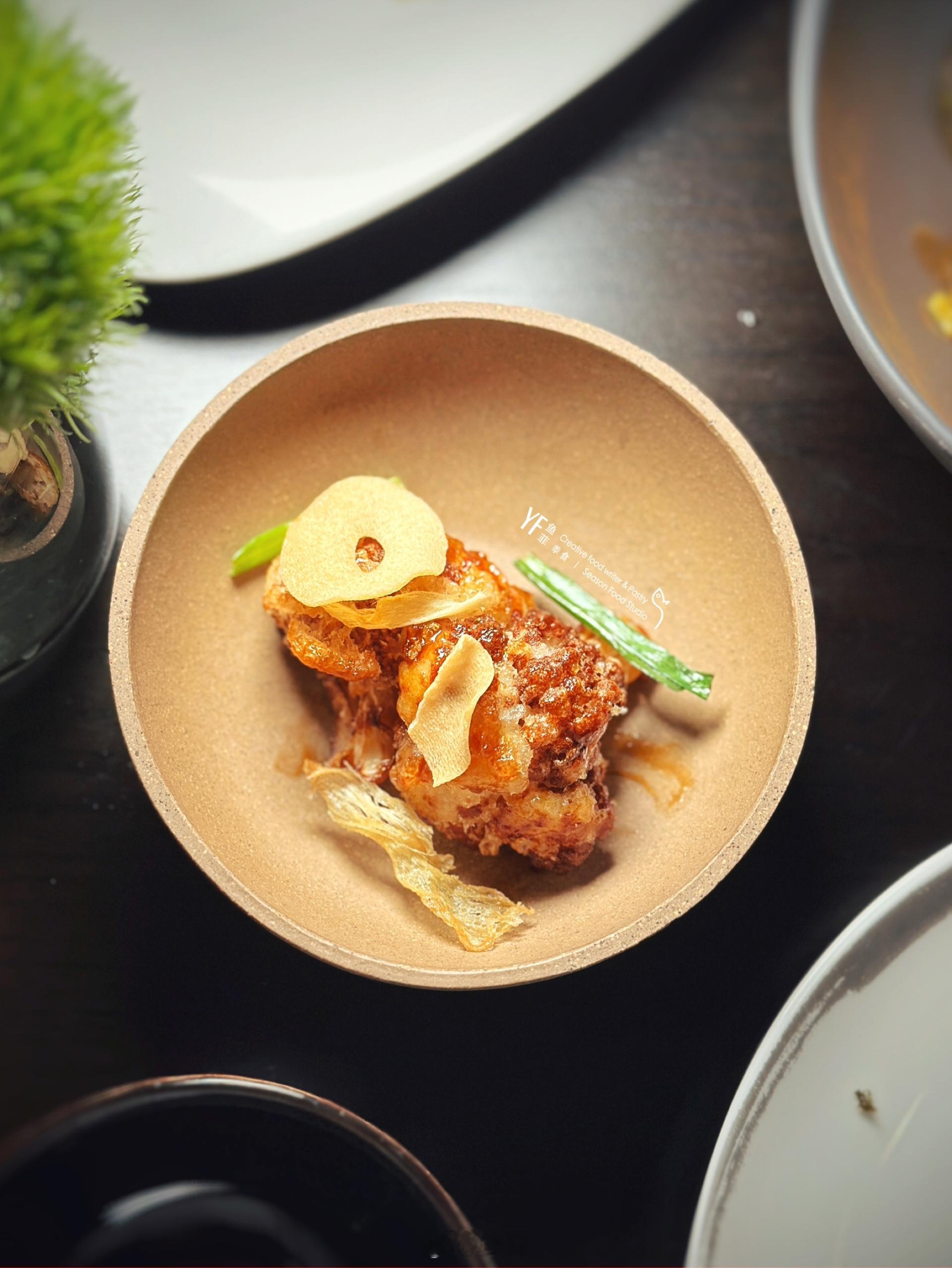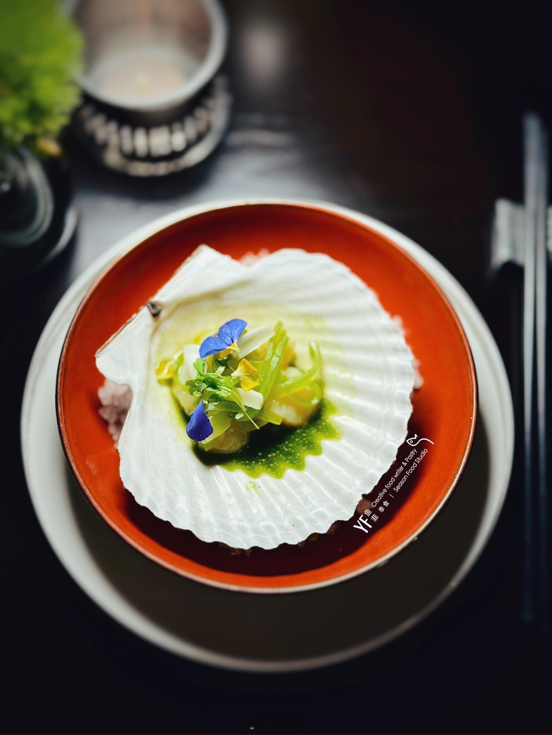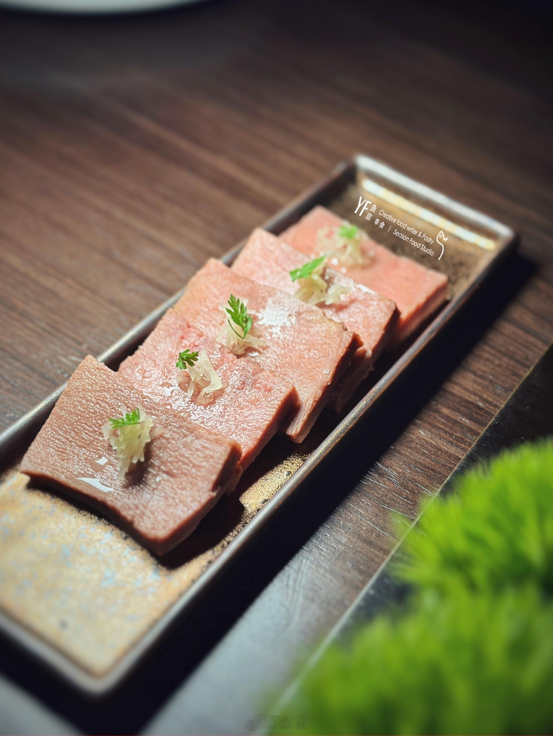 五道式菜品,开场鲜带子莴笋沙拉🐚,一如湿了瓦岱的青砖,以四川青花椒汁搭配鲜百合,微微的椒麻香气氤氲在食材上,佐味些许椰青水果冻,新鲜盈口。白卤水牛舌心,搭配子姜莎拉,透着一股特殊的香气,丰腴。
