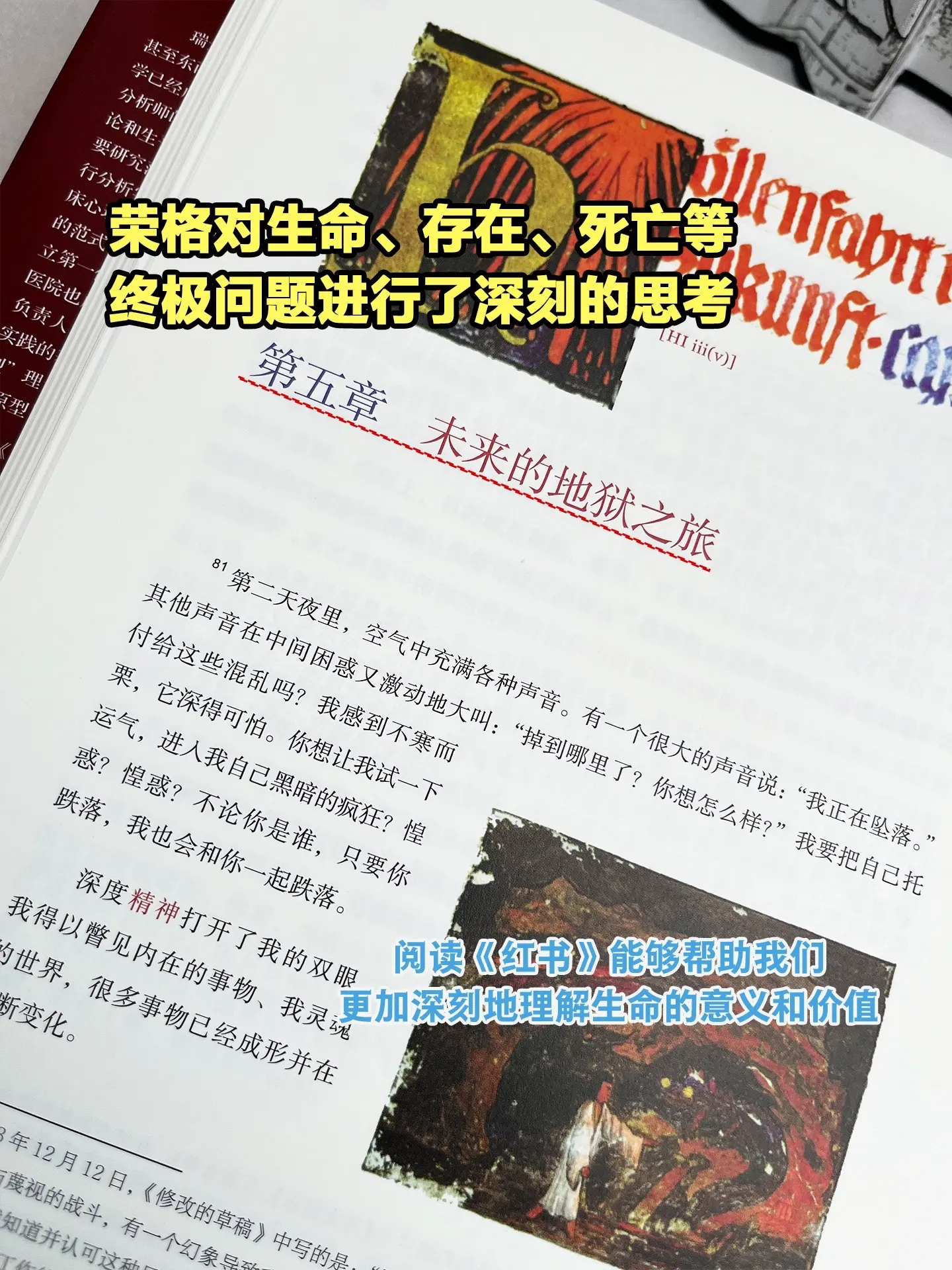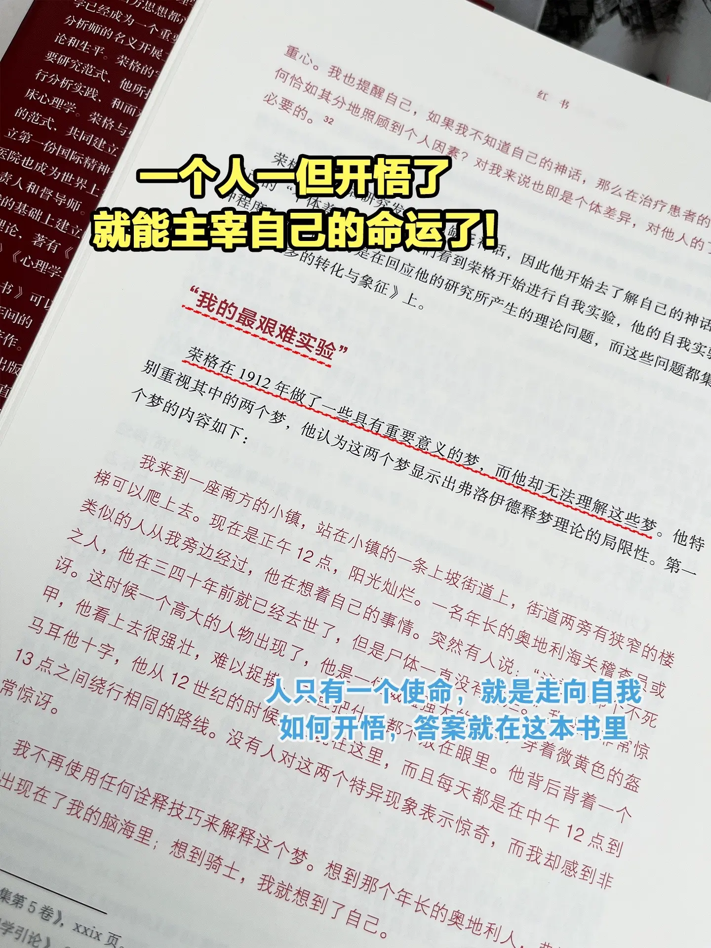 任何想赋子灵魂生命的人都应该阅读荣格的这本《红书》,他说:“人生从40岁真正开始,在那之前你只是在做调研而已。”这本书是荣格的心灵秘境,一部被尘封半个世纪的心理学瑰宝。读完后我仿佛经历了一场心灵的洗礼,它让我更关注自己的内心世界,学会倾。内心的声音。同时,也让我对人类的精神现象充满了敬畏和好奇。我相信,这本书将成为我在探索心灵之旅上的重要指南,不断激励我去追寻内心的真实和成长。