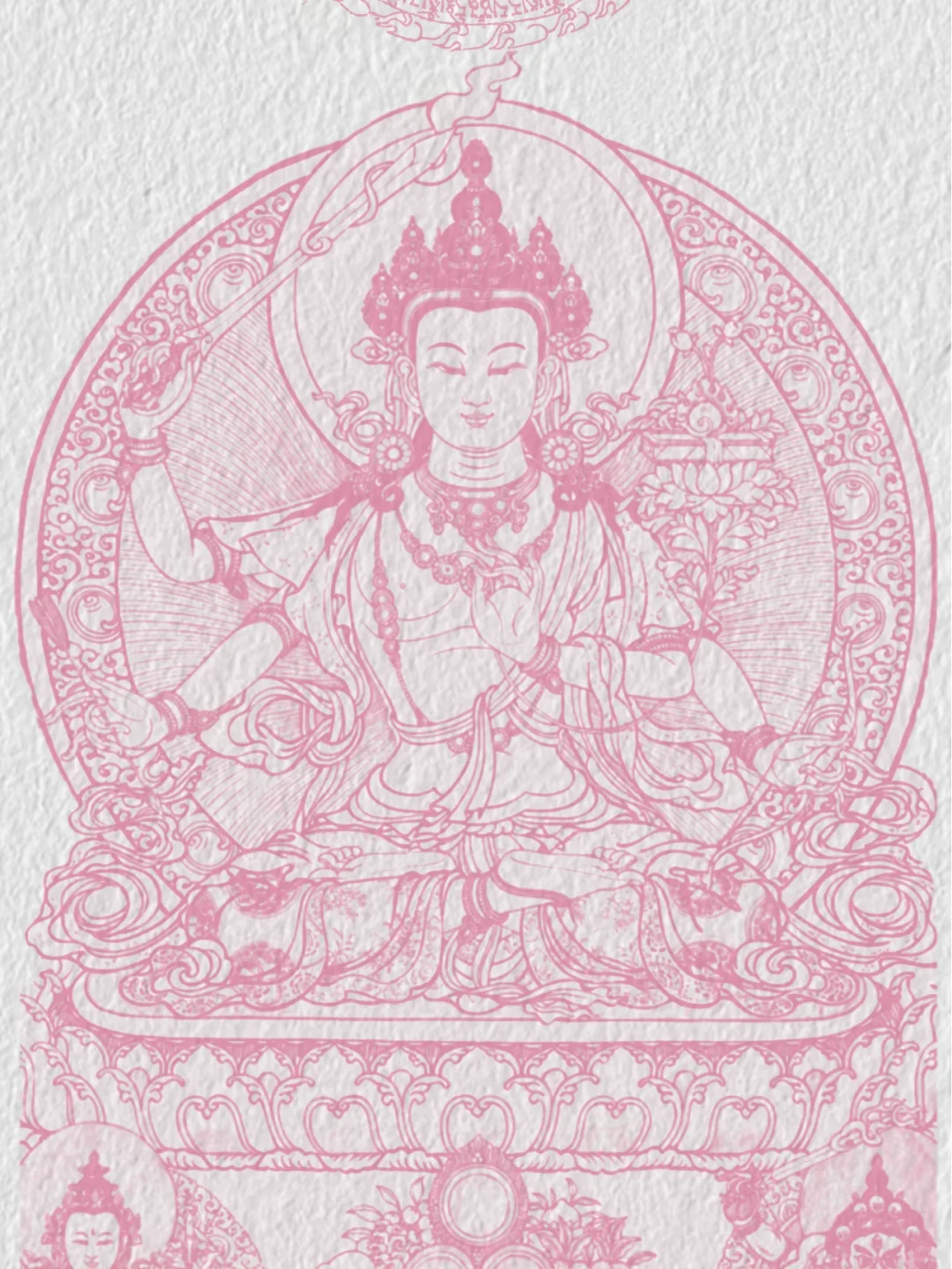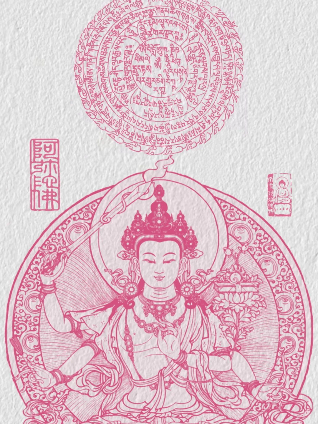粉色文殊菩萨 是智慧的化身。代表智慧和悟性,是佛教徒修行智慧的楷模。通常是手持宝剑, 象征斩断无明和烦恼,以及持有经书,代表智慧和知识。