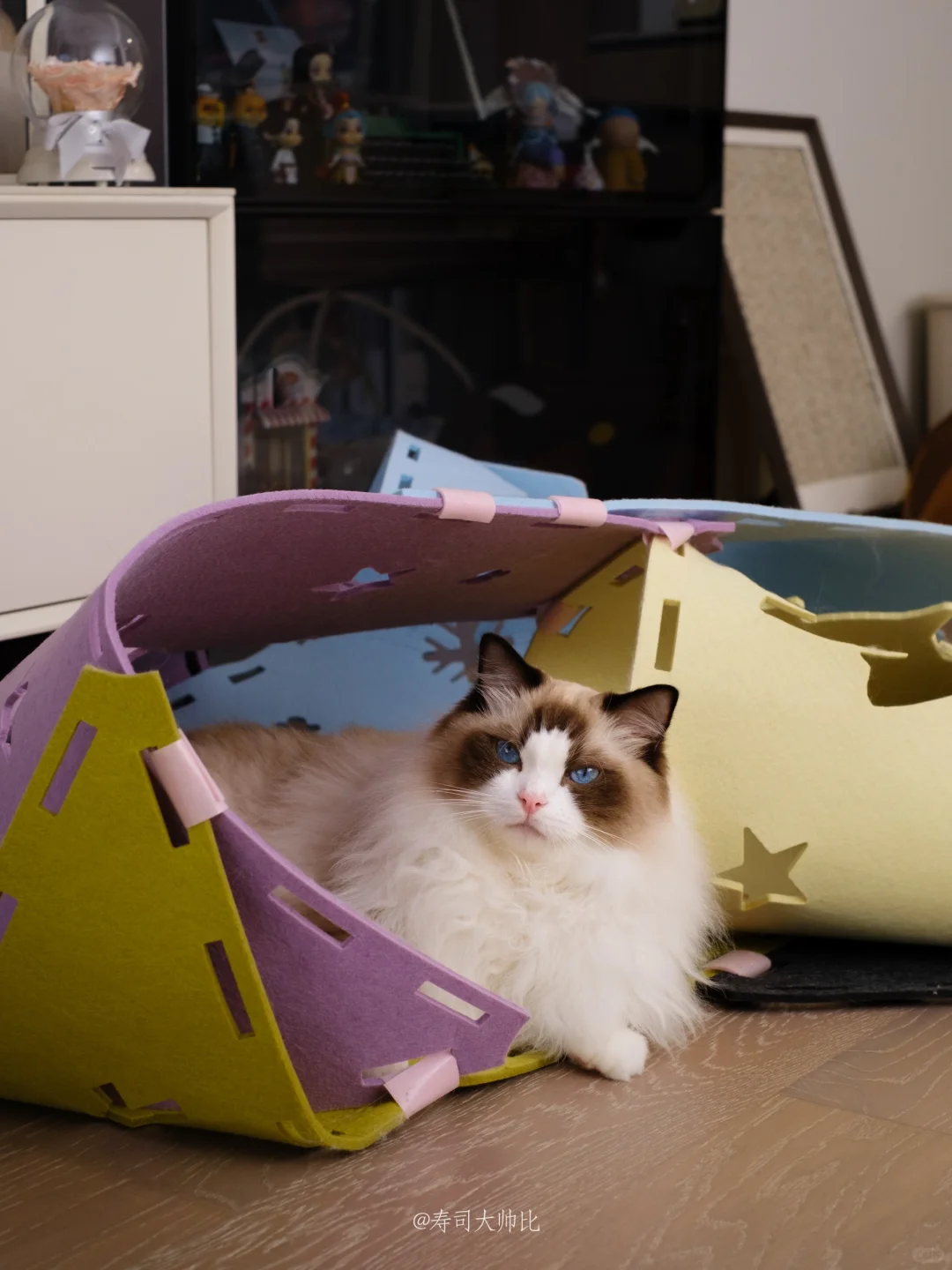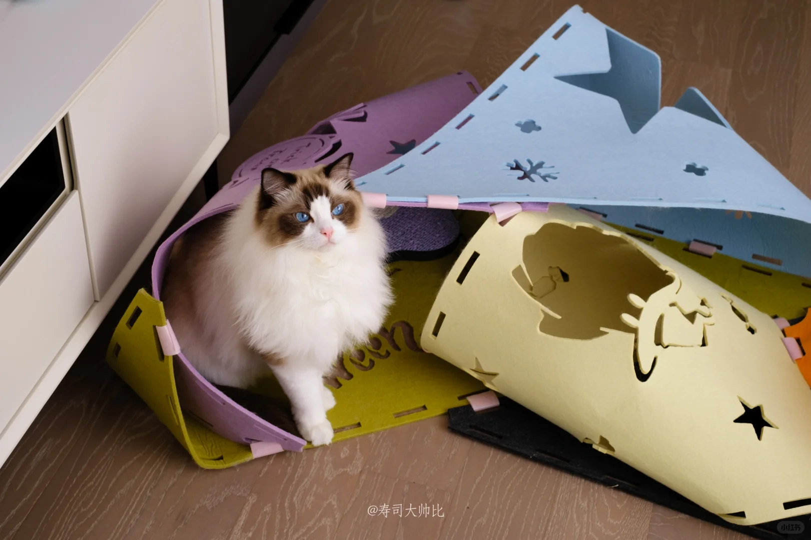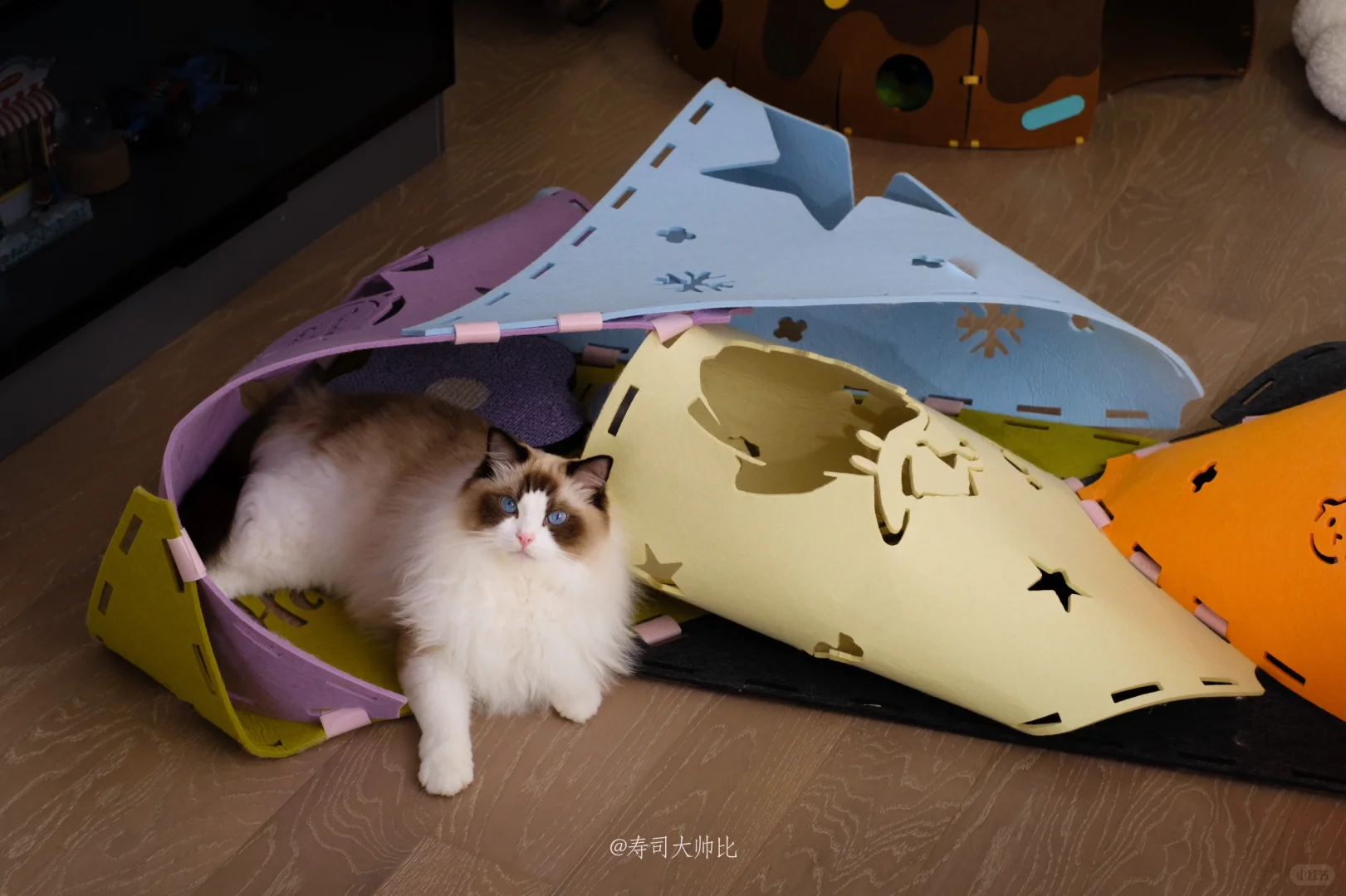 自从购入miamia游戏毯后它就成了寿司日常生活的主角,寿司会在玩耍时第一时间躲进去紫色区域藏好,准备伏击捕猎!也会在闲暇时躺在里面睡觉,非常安逸~ 看到越来越多家长购入了这款游戏毯,并且都发挥创意做出了好多有趣的造型,我想他们的毛孩子一定也很快乐! 因为游戏毯+逗猫棒才是逗猫棒的正确打开方式啊[赞R] 道具和玩具都准备好了,快和你的毛孩子玩耍去吧~ 游戏毯:MiaMia原创设计