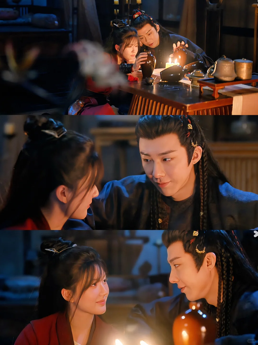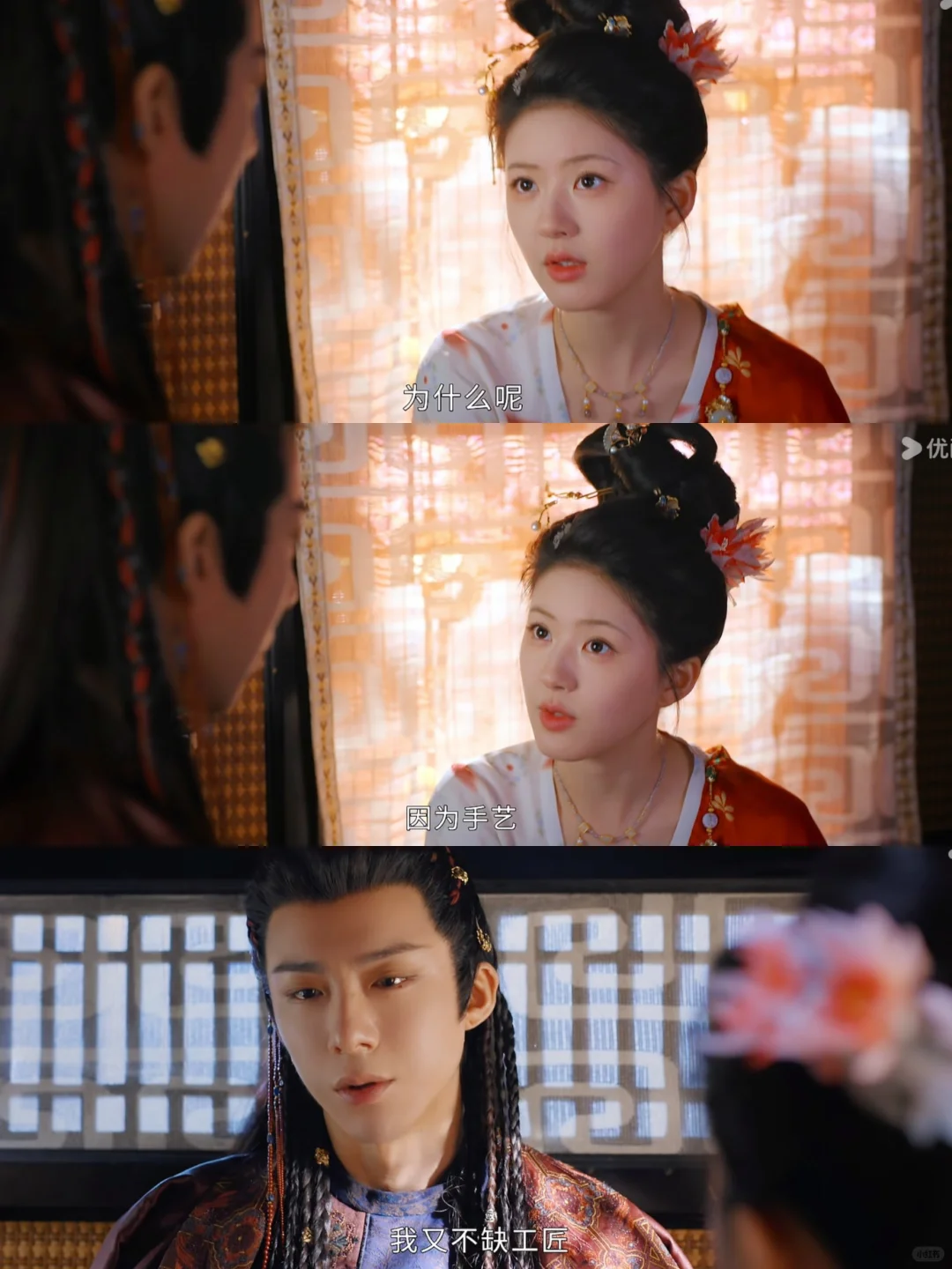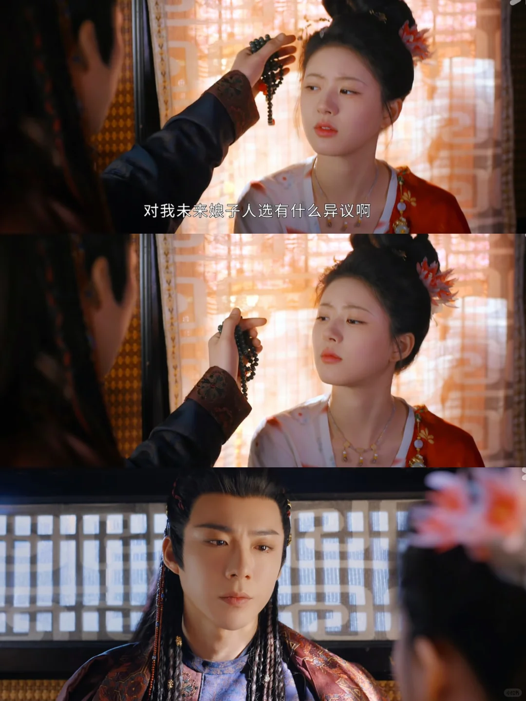 马车上他有些出神,端午问他他有那么一刻下意识地想扶正她的发簪。我觉得这个画面好让人心动啊,这种半明半昧暧暧昧眛的拉扯感太勾我了。珠帘玉幕真的好细节啊喜欢喜欢