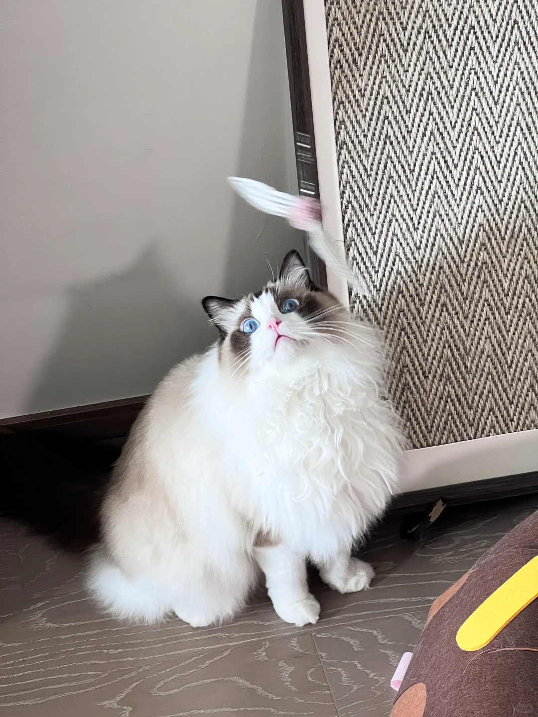 4. 玩耍时不一定需要跳跃狂奔才代表尽兴。猫咪的捕猎过程大概分为观察-伏击-出击-玩弄猎物-进食这几个步骤,跳跃仅出现在“出击”这个步骤。也就意味着只要你拿出逗猫棒,小猫的注意力被你吸引了,此时小猫就已经进入了捕猎状态,也就意味着他们正在调动着全身的感官来感受这场捕猎游戏。所以家长们不要气馁,孩子的眼神捕猎也是捕猎!