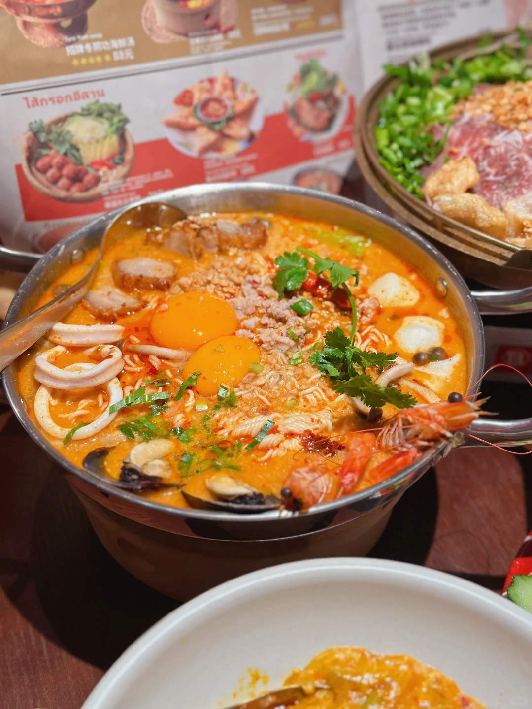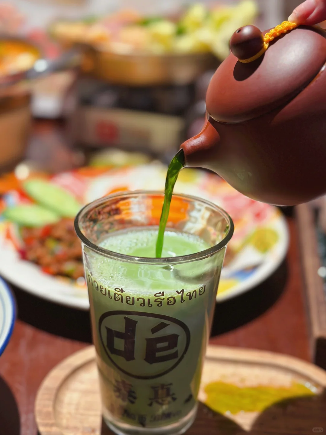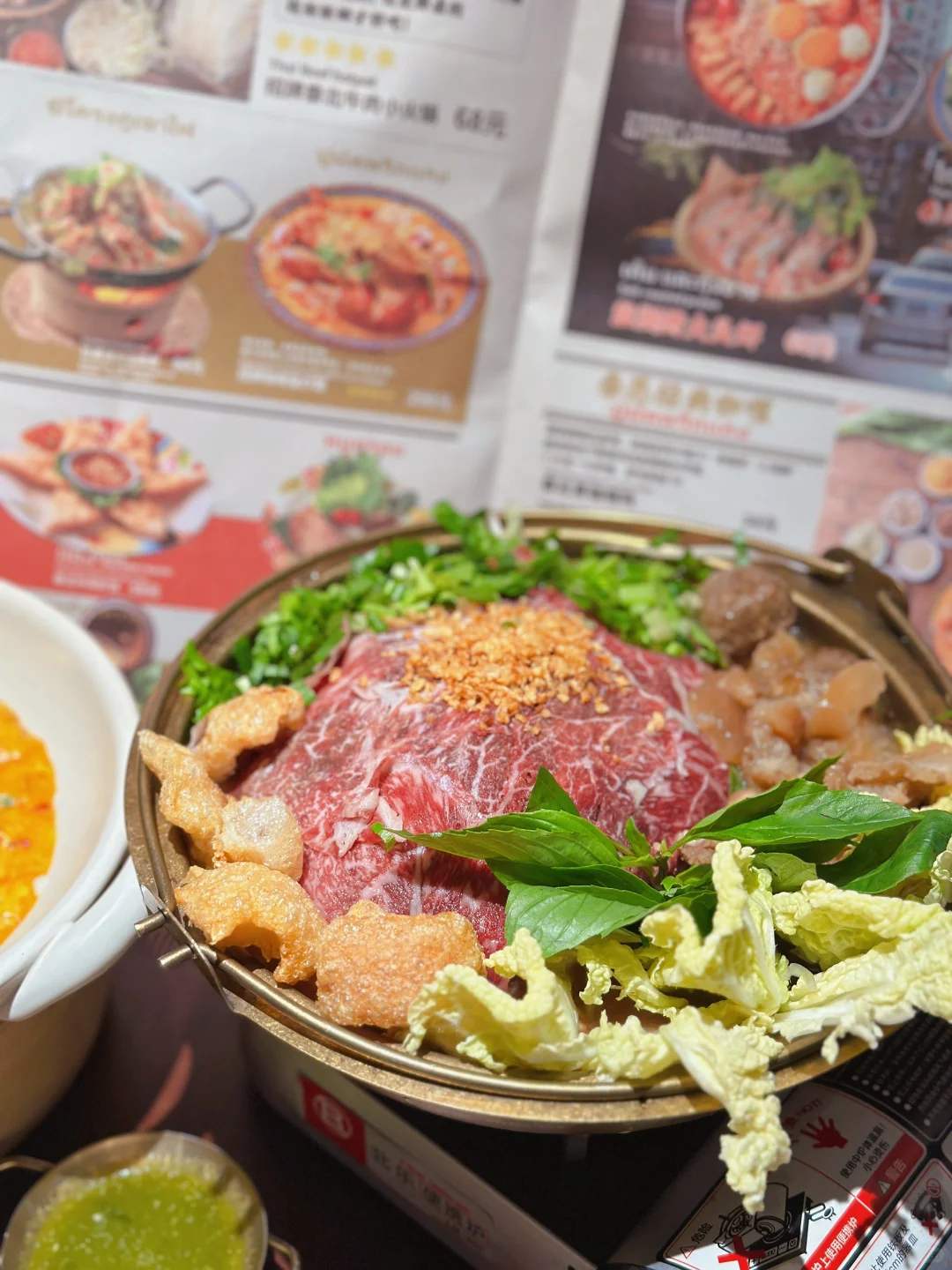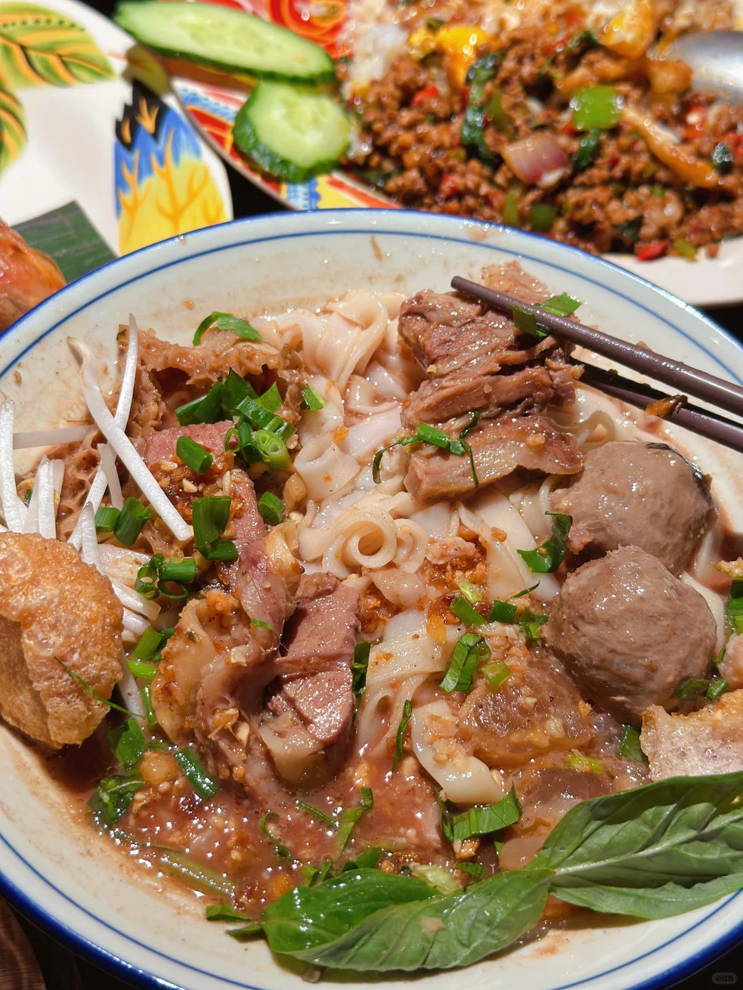 这年头谁还做吃预制菜的大冤种,这家是由有着三十年本土经验的🇹🇭总厨亲自现点现做的泰国船面,包正宗美味的。 · 🌈招牌鲜切牛肉(牛三宝)船面 牛肚、牛肉🥩、牛肉丸组成的这碗招牌船面,就连汤底都满是肉香,入口即化的面条老少皆宜。 · 🌈雪花牛上脑船面小火锅 天气渐凉来一锅这样的船面小火锅再合适不过了,热气腾腾的雪花牛上脑,不禁让人垂涎欲滴。 · 🌈人生泰奶/泰绿 在他家我还喝到了我的人生泰奶🧋,无论你喜欢绿茶底还是红茶底,伴着馥郁的茶香坐在室外的阳光下,惬意的享受午后的时光吧。