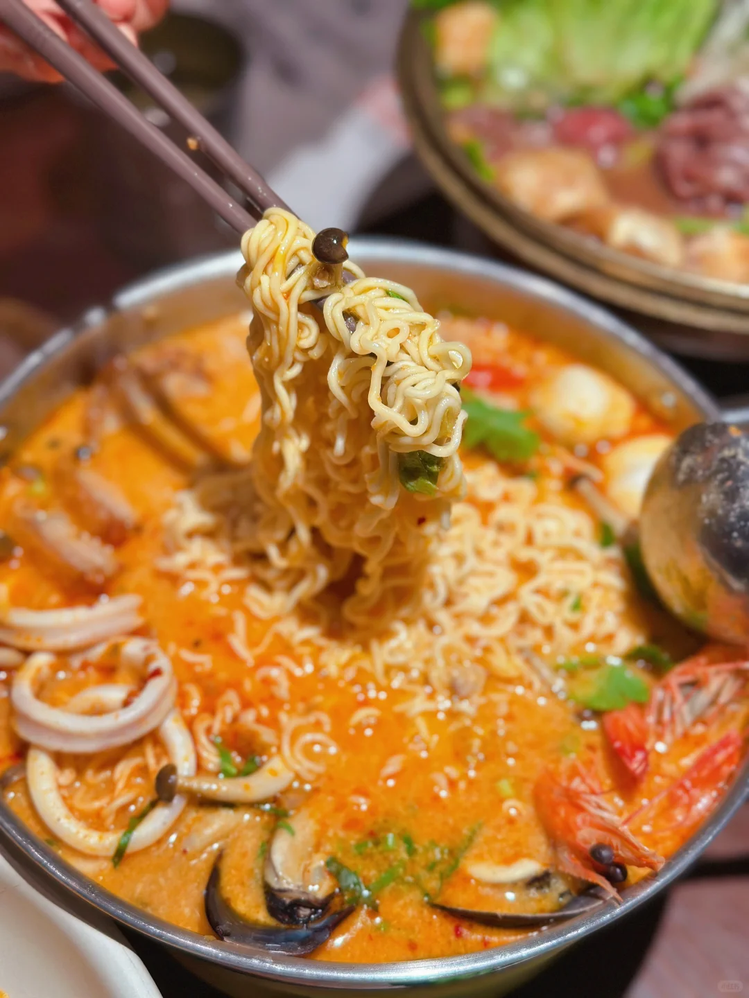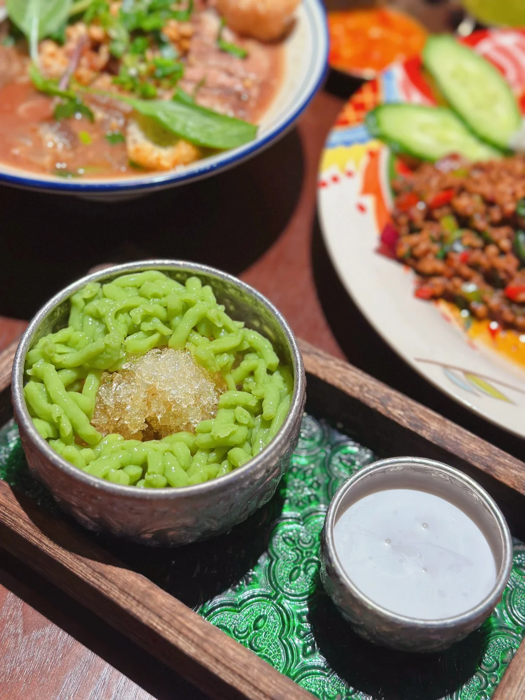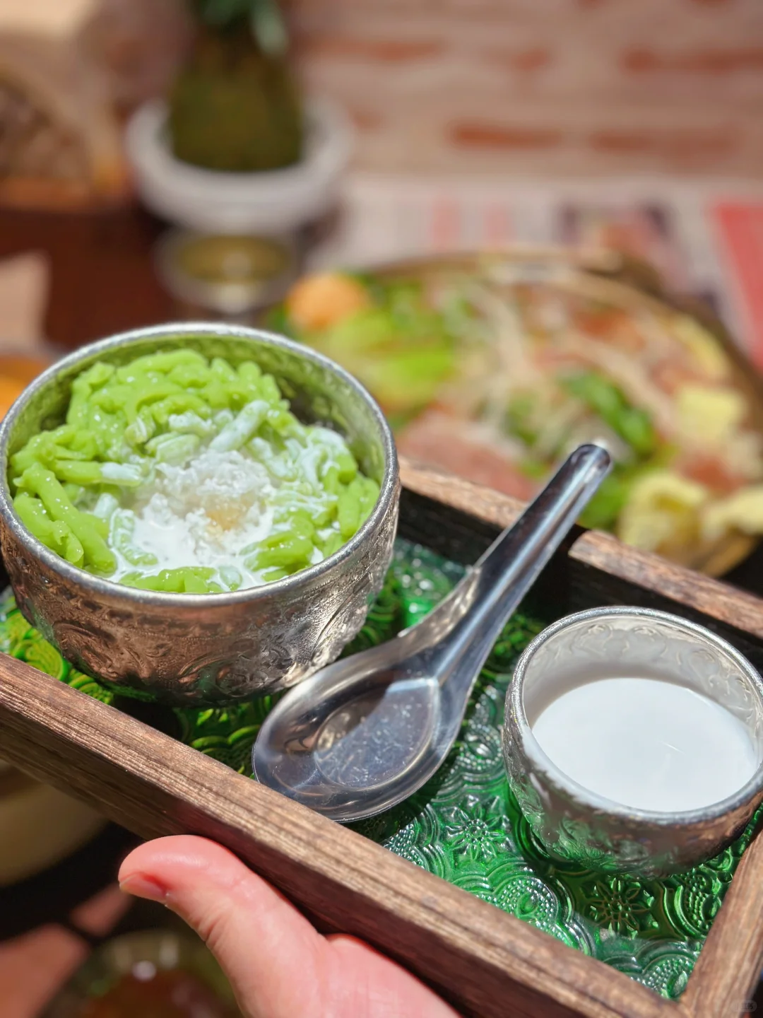 这年头谁还做吃预制菜的大冤种,这家是由有着三十年本土经验的🇹🇭总厨亲自现点现做的泰国船面,包正宗美味的。 · 🌈招牌鲜切牛肉(牛三宝)船面 牛肚、牛肉🥩、牛肉丸组成的这碗招牌船面,就连汤底都满是肉香,入口即化的面条老少皆宜。 · 🌈雪花牛上脑船面小火锅 天气渐凉来一锅这样的船面小火锅再合适不过了,热气腾腾的雪花牛上脑,不禁让人垂涎欲滴。 · 🌈人生泰奶/泰绿 在他家我还喝到了我的人生泰奶🧋,无论你喜欢绿茶底还是红茶底,伴着馥郁的茶香坐在室外的阳光下,惬意的享受午后的时光吧。