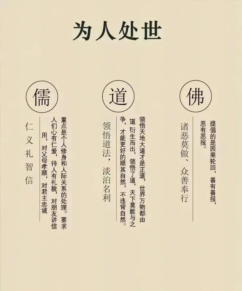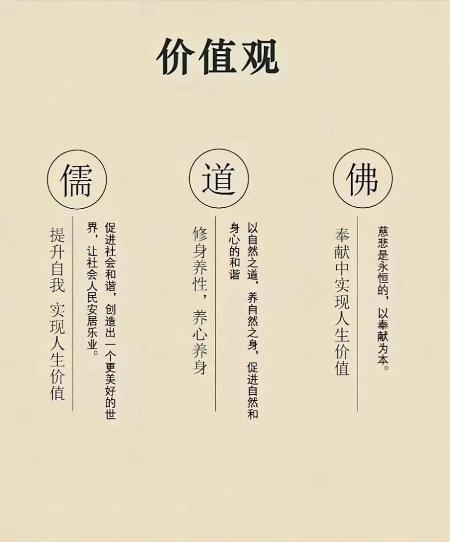 儒道佛三家的思想精髓 儒家思想: 儒家思想以“仁”为核心,主张“修身、齐家、治国、平天下”。儒家认为人应该修养自己的品德,做到仁爱、孝悌、忠信、礼义、智勇,才能成为一个有用的人,并在家庭、社会、国家中发挥积极的作用。 道家思想: 道家思想以“道”为核心,主张“道法自然、无为而治”。道家认为宇宙万物都遵循着“道”的法则,人应该顺应“道”,不要强行干预。道家追求的是“无为”的生活状态,即不刻意为之,而让万事万物自然而然地发展。 佛家思想: 佛家思想以“空”为核心,主张“认识无常,解脱轮回”。佛家认为世间万物都是因缘和合而生,没有永恒不变的存在。只有认识无常,才能看淡生死,从而获得解脱。佛家的最高境界是“菩提”,即彻悟人生真相,帮助众生解脱轮回。 儒道佛三家的相互关系: 儒道佛三家学说各成体系,博大精深,但并不对立。好学者如能融会贯通,兼容并取,就更能在实际社会生活中得舍有度,建功立业。 #闲聊道德经# #心易道德经#