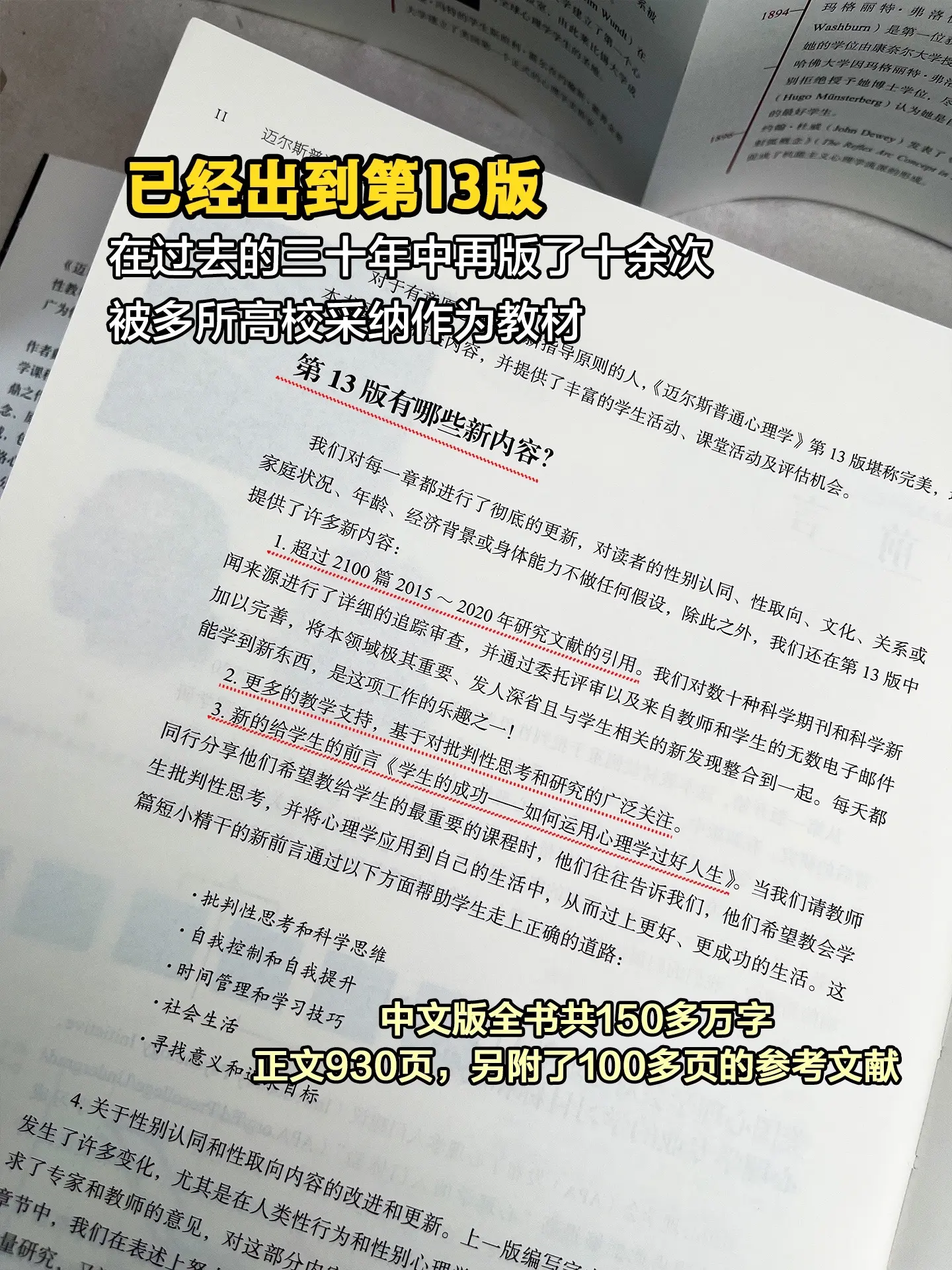 一旦女生开始研究心理学,人际关系就像开了上帝视角!为何选择本书作为你的第一本心理学入门书?这本《迈尔斯普通心理学》,由美国著名教科书作者戴维·迈尔斯撰写,其在心理学教材写作方面无与伦比的才能,使得本书因幽默风趣的文风和流畅前沿的理论更新,自出版以来一直被奉为心理学入门的经典教材,常年霸榜美亚心理学人门教材的榜首,并被翻译成多种语言在世界各人高校广为使用,全球有数百万学生在用它来学习心理学。特别是该书提出以学生为中心、以批判性思考为引导、以解决实际问题加强理解普通心理学的学习模式,更是独树一帜。同时新版还立体地展现了心理科学的魅力,可读性强,非常精彩。新版尤其注意了对人类统“性和多样性的尊重与关怀,集中体现了时代精神。是特别适合我国读者的教科书和心理学参考书。