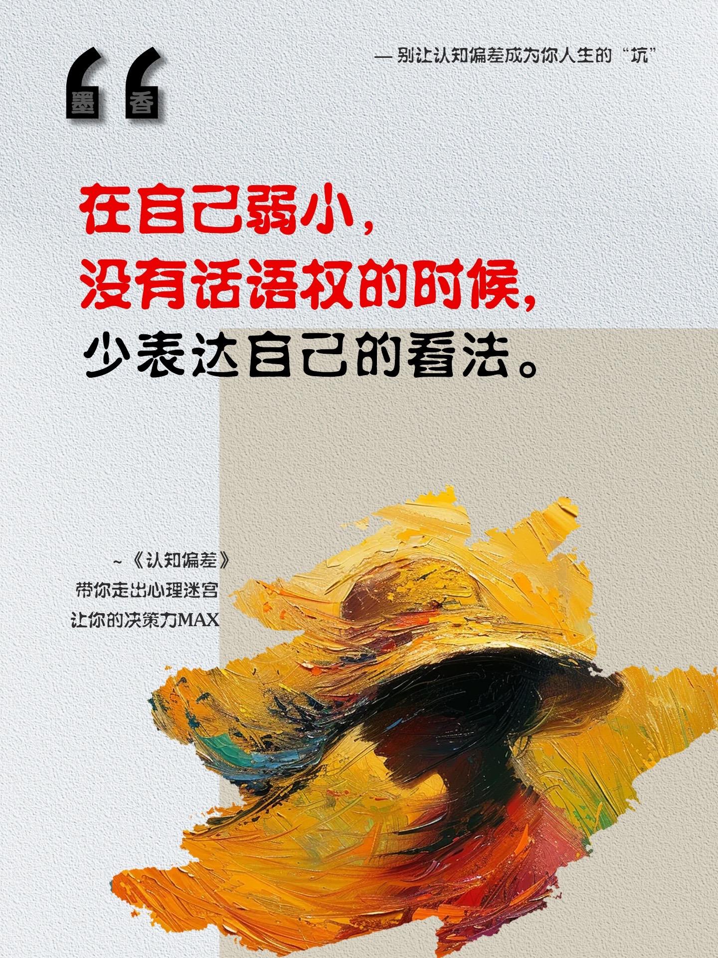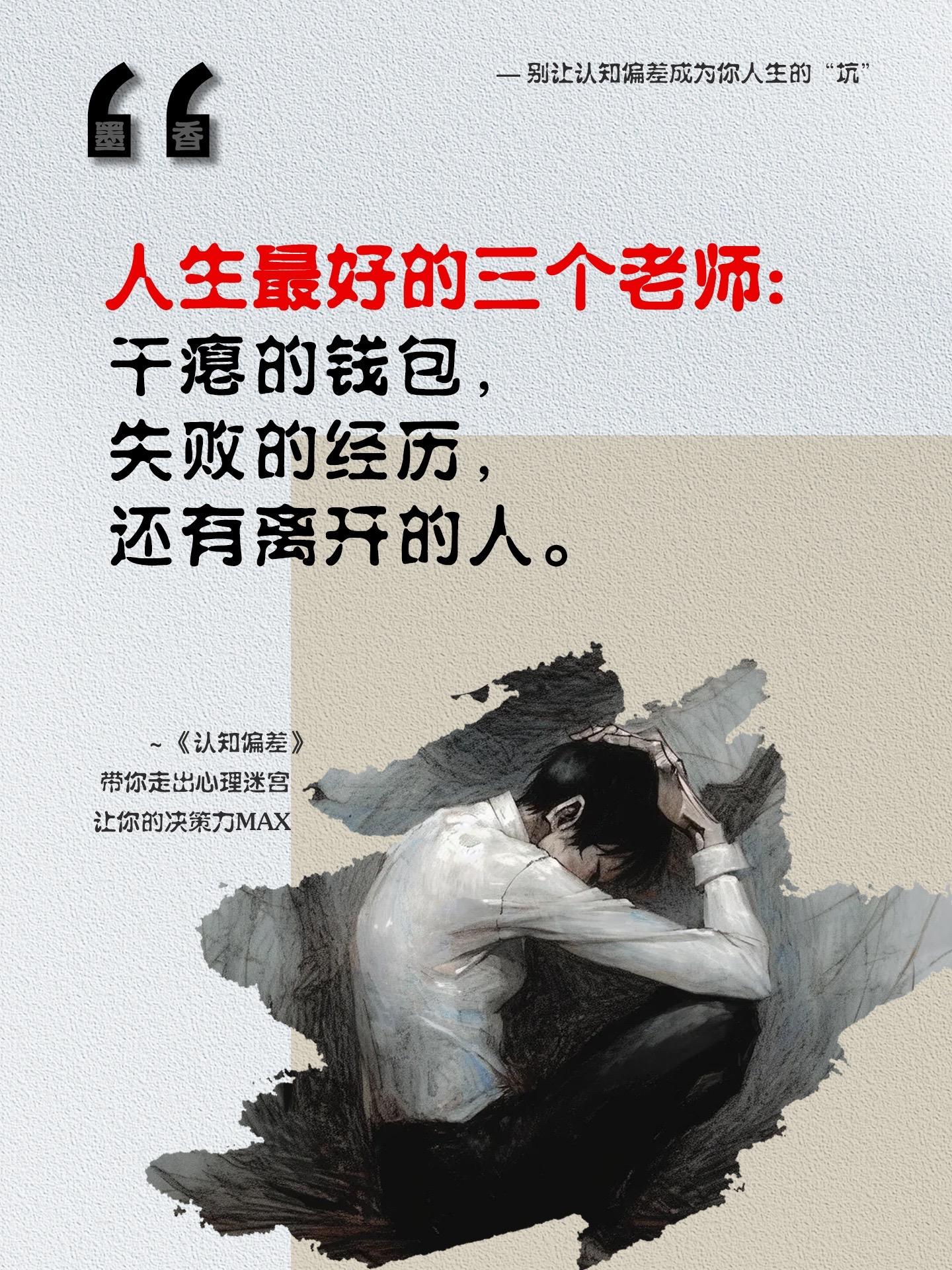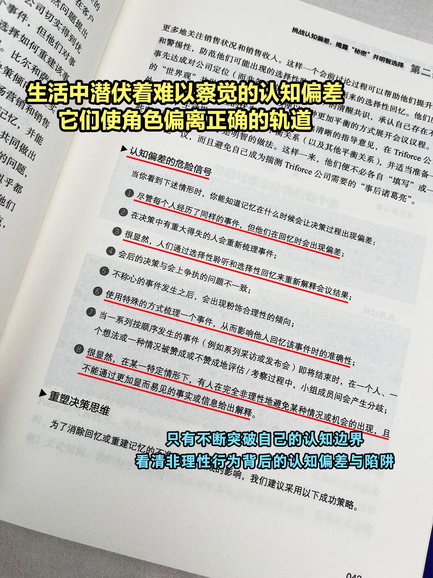 人生最好的三个老师:干瘪的钱包,失败的经历,还有离开的人!所以在自己弱小没有话语权的时候,少表达自己的看法。事业成功最为关键的要素是我们所做出的判断和决策的质量。如果我们的认知有偏差就会做出错误的决策,并付出一定的代价。这本《认知偏差》向读者介绍了一套颇具针对性的决策诊断法,它能帮助企业领导者和个人反省自己的决策行为,并选择自己希望做出的改变。剖析常见的认知偏差现象,讲解认知偏差产生的原因,提供摆脱认知偏差的方法,让你在生活和工作中更加明智。