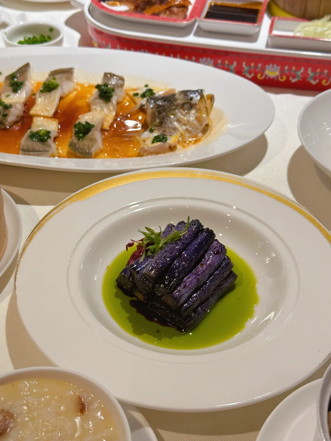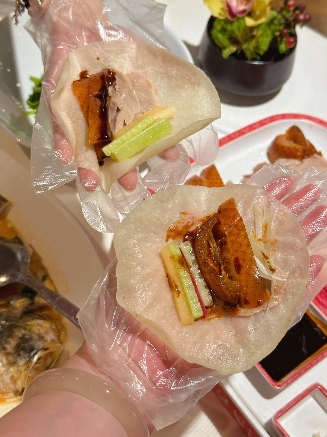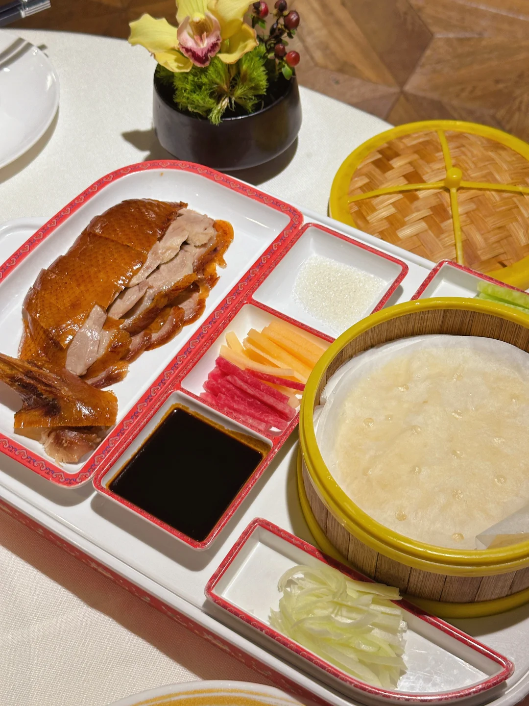 油光蹭亮的烤鸭由厨师👨🏻🍳推着小车到桌边静心一片片的切片盛盘,用薄如蝉翼的饼皮包着,搭配清新的黄瓜🥒和葱丝,吃起来也一点不会觉得腻。