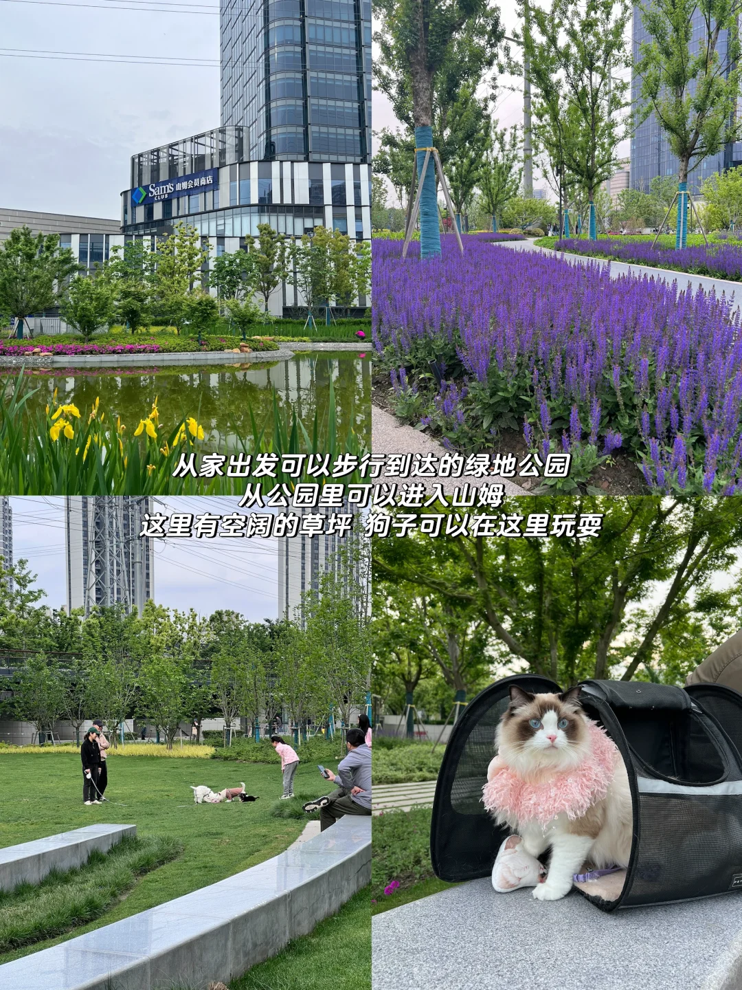 对于有遛狗和遛猫需求的家长来说,住在这里真的很便利。公寓楼下就有小花园,狗狗可以在这里玩扔球游戏,寿司也经常在这里闻嗅花花草草。从家楼下步行距离可到达环宇城,一个去年开业的宠物友好商场。从商场可以步行直达山姆,从山姆出来便是一个开放式绿地公园。周边配套对于我来说已经完全足够了。有时候我会带寿司去绿地公园溜达,虽然那里周末人多狗狗也多,但偶尔公园二十分钟真的太舒服了。