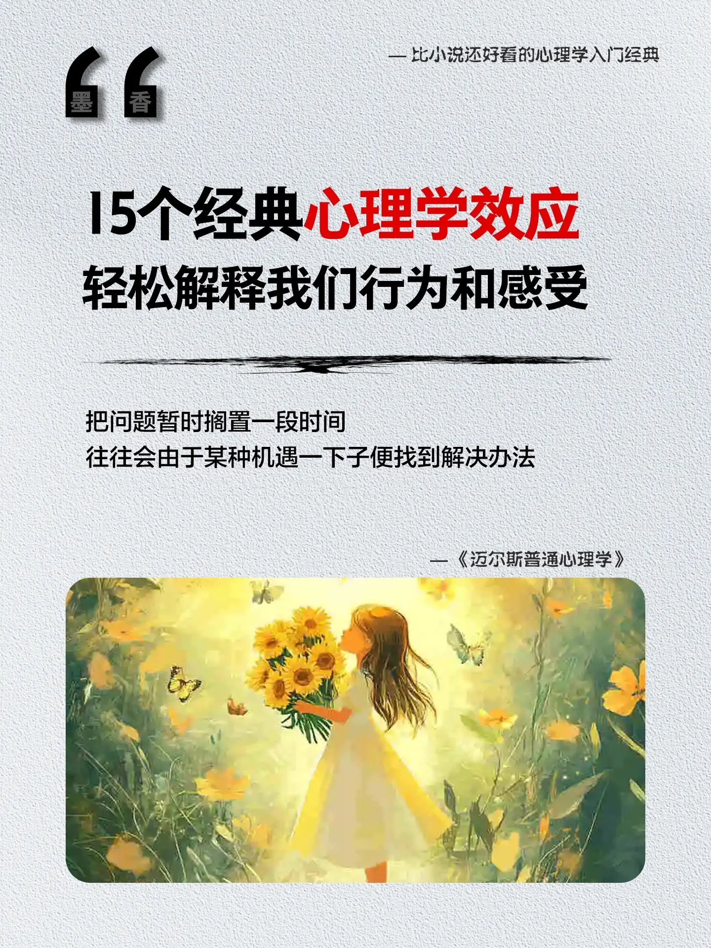你有没有发现:把问题暂时搁置一段时间,往往会由于某种机遇一下子便找到解决办法!15个经典心理学效应,轻松解释我们行为和感受。这本《迈尔斯普通心理学》中运用了独特的迈尔斯幽默写作风格,不仅让经典的科学心理学研究亲切而流畅地展现在读者面前,更加入了2000多篇近10年间心理学最新研究文献,很好地展现了心理学发展的日新月异与人文关怀。书中的学习目标、自测与批判性思考等设计贯穿始终。如果你也想研究心理学,那么读这一本书就够了!