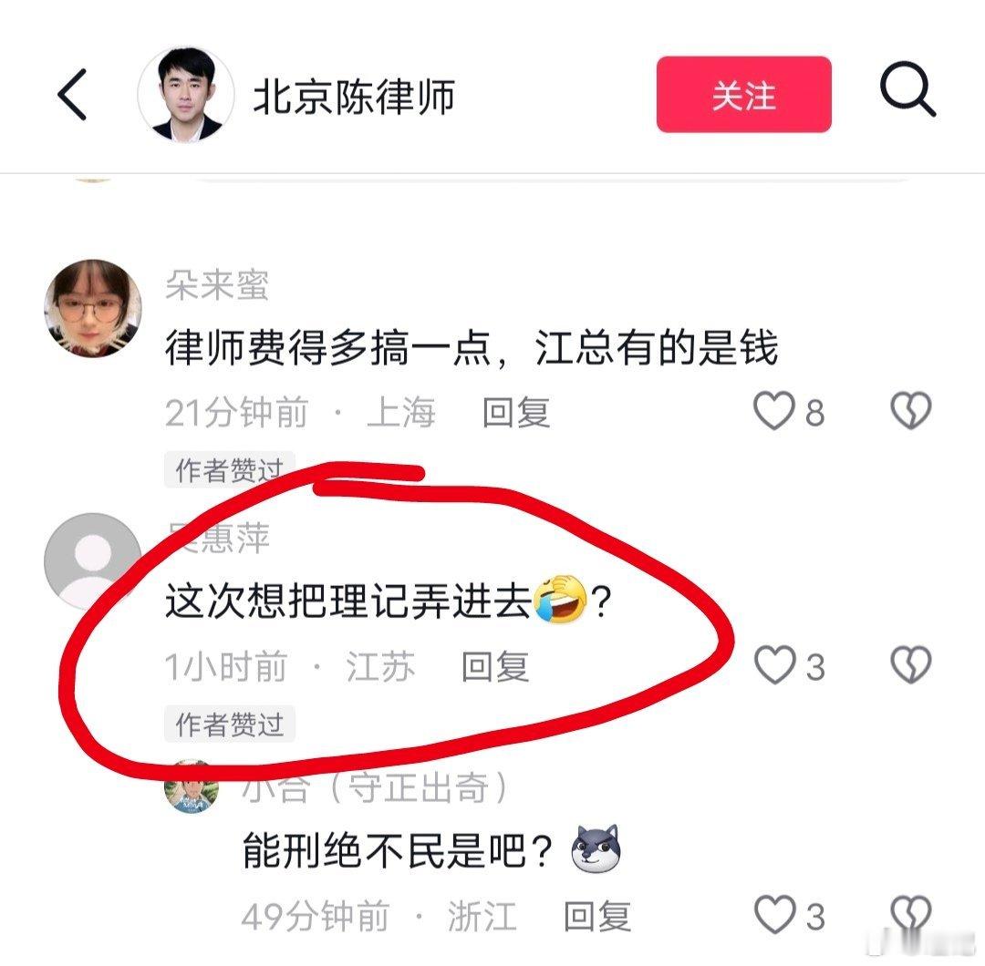 其次,目前尚不知陈律师是否已经接受江秋莲女士代理委托,但我已取证,你在抖音评论区两次点赞“要把理记送进去”的言论。