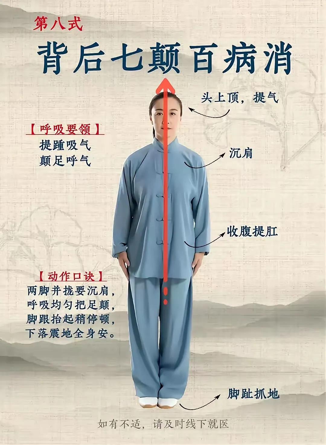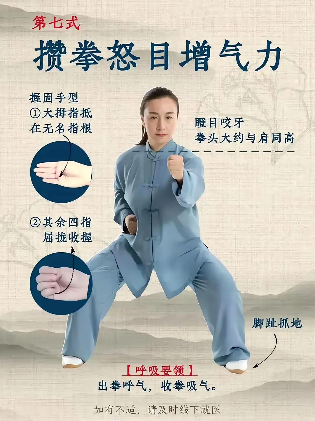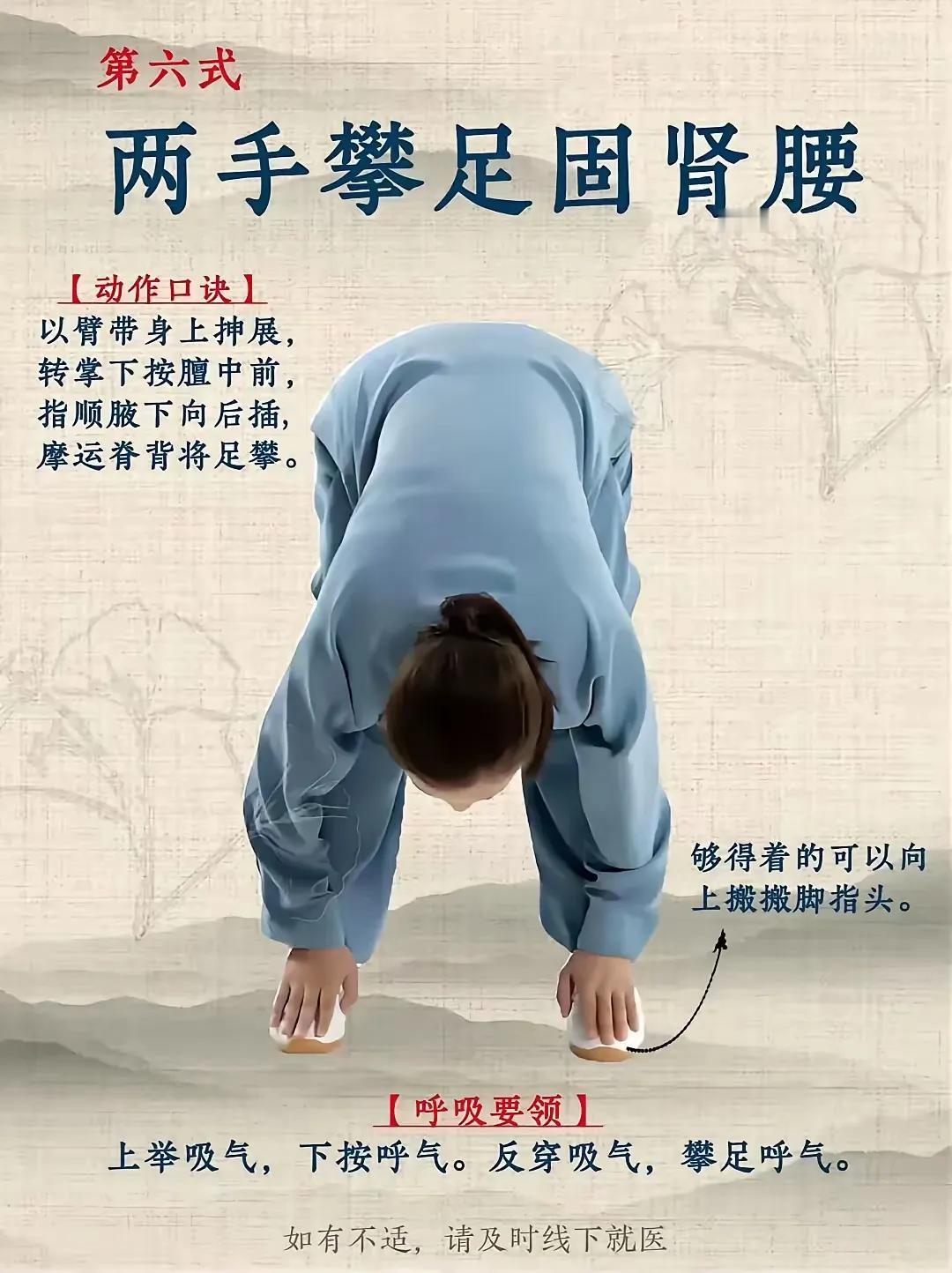 八段锦是一种传统的中医养生功法,起源于北宋,已有八百多年的历史。它由八个动作组成,每个动作都有其特定的健身效果,整体动作柔和缓慢、圆活连贯,符合人体各关节自然弯曲的状态。 八段锦的具体动作包括: 两手托天理三焦:通过上举双手,帮助头部血液循环,缓解头脑疲劳。 左右开弓似射雕:通过拉弓射箭的动作,充分拉伸肩部肌肉。 调理脾胃须单举:双手轮流上举过头,帮助按摩腹部脏器,促进消化。 五劳七伤往后瞧:双手反背,身体前屈后仰,全面按摩脏腑,活动脊柱。 摇头摆尾去心火:通过摇头和摆臀尾的动作,刺激督脉,消除心火。 两手攀足固肾腰:上身前屈,双手抱住脚踝,增强腰部肌肉力量。 攒拳怒目增气力:通过握拳和怒目圆睁的动作,增强全身爆发力。 背后七颠百病消:双脚前掌撑地,颠脚7下,强化肌体韧性。 八段锦不仅是一种健身方法,还具有丰富的历史内涵和文化底蕴。它通过形体活动、呼吸吐纳和心理调节三者相结合,具有调息脏腑、运行气血、畅通经脉、强健筋骨、凝心安神的功效。由于其动作简单、容易掌握,属于中低强度的有氧运动,深受中老年人的欢迎。