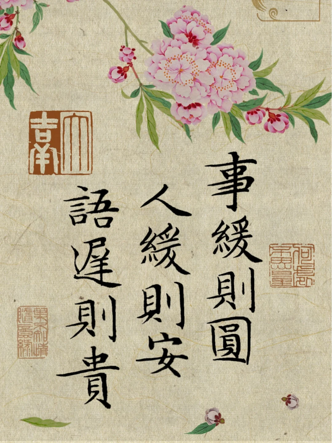 事缓则圆,人缓则安,语迟则贵。是中国古代的一种人生哲理,意在告诫人们面对事情应当沉着冷静, 不应急于求成;在与人交往时应保持平和的态度,不要急躁;在言语表达上则应谨慎,不要轻易发言。 它教会我们在快节奏的社会中如何保持内心的平静和从容。让我们学会放缓脚步,去品味生活的美好, 去感受内心的安宁,去传递真正的价值和意义。