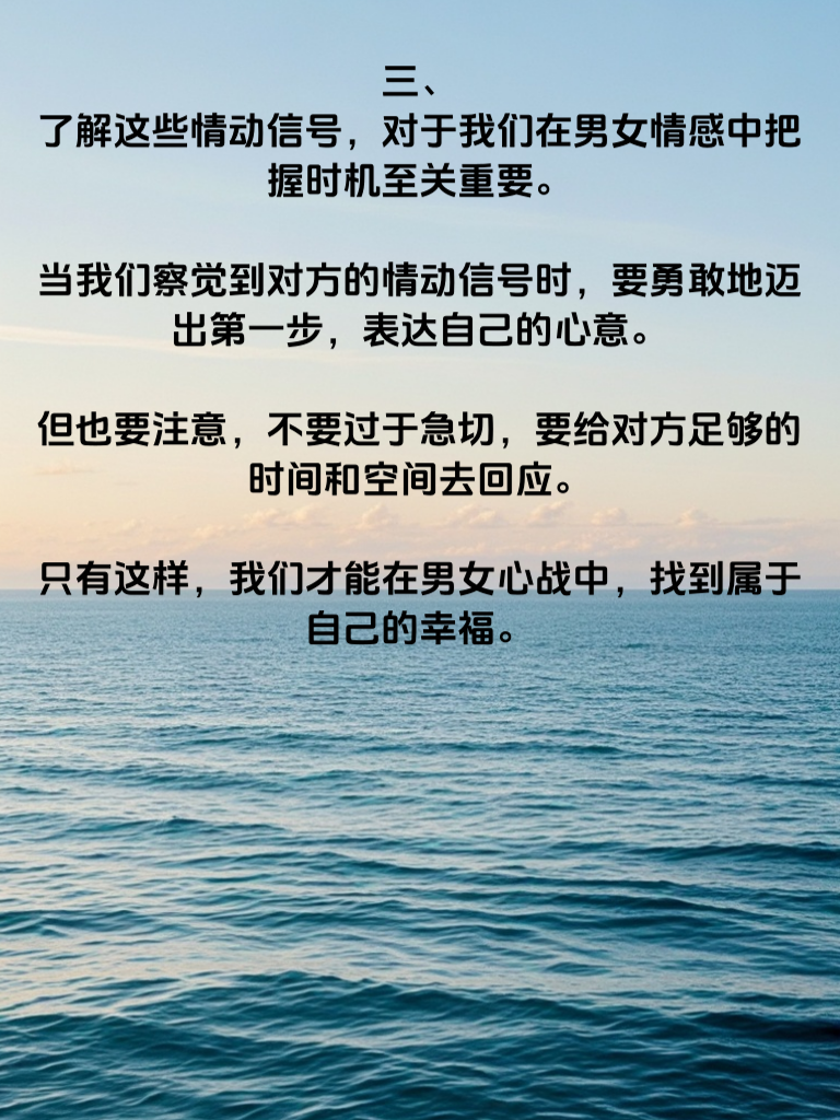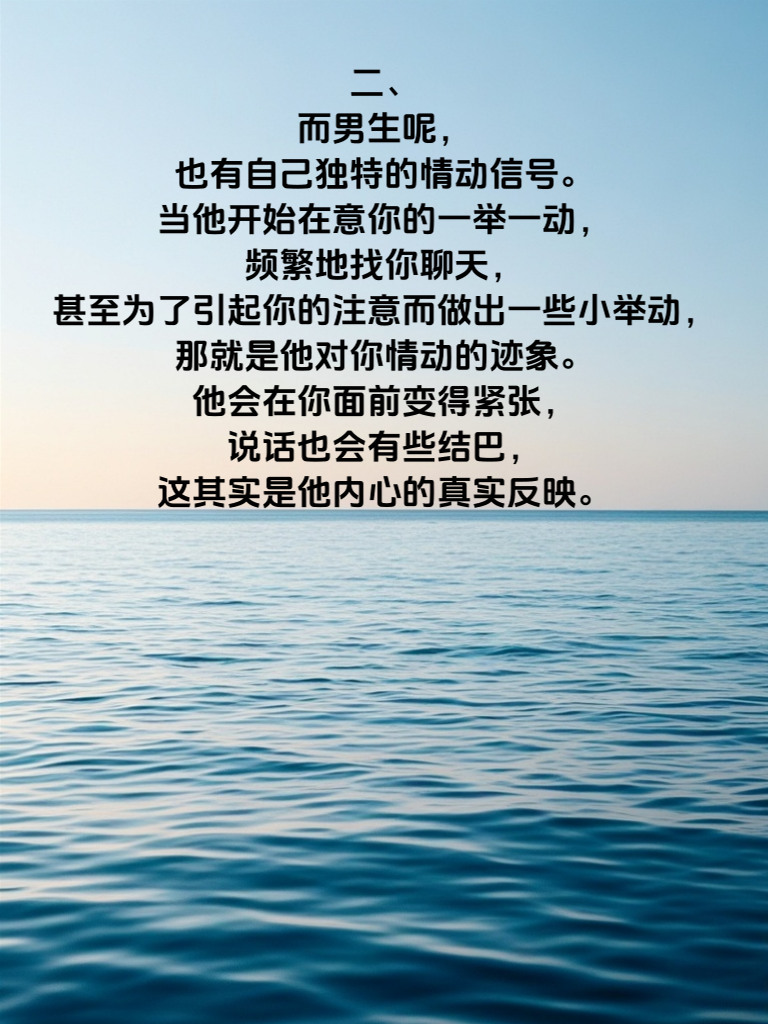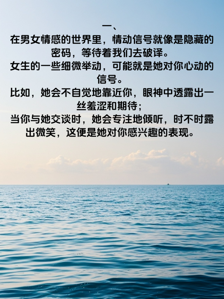 一、在男女情感的世界里,情动信号就像是隐藏的密码,等待着我们去破译。女生的一些细微举动,可能就是她对你心动的信号。比如,她会不自觉地靠近你,眼神中透露出一丝羞涩和期待;当你与她交谈时,她会专注地倾听,时不时露出微笑,这便是她对你感兴趣的表现。 二、而男生呢,也有自己独特的情动信号。当他开始在意你的一举一动,频繁地找你聊天,甚至为了引起你的注意而做出一些小举动,那就是他对你情动的迹象。他会在你面前变得紧张,说话也会有些结巴,这其实是他内心的真实反映。 三、了解这些情动信号,对于我们在男女情感中把握时机至关重要。当我们察觉到对方的情动信号时,要勇敢地迈出第一步,表达自己的心意。但也要注意,不要过于急切,要给对方足够的时间和空间去回应。只有这样,我们才能在男女心战中,找到属于自己的幸福。