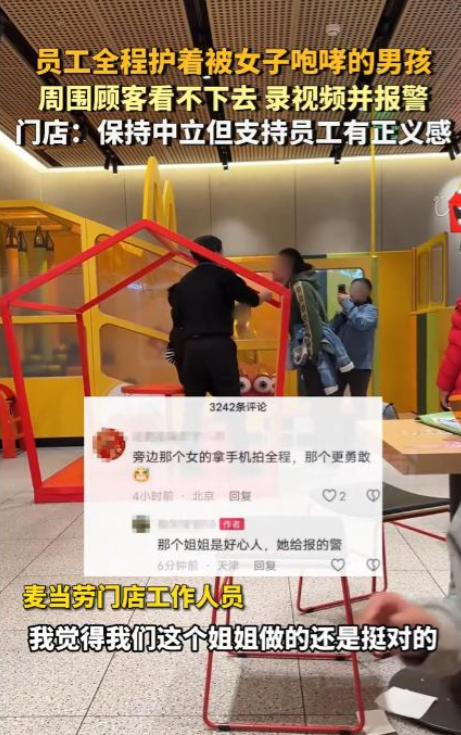 12月1日, 天津,男孩带弟弟在麦当劳公共区域玩耍,一女子认为男孩妨碍她孩子了,咆哮大吼教育男孩。旁边的店员全程护着男孩,劝说女子冷静,结果男孩反问了女子一句,女子破防了直接开始咆哮起来...