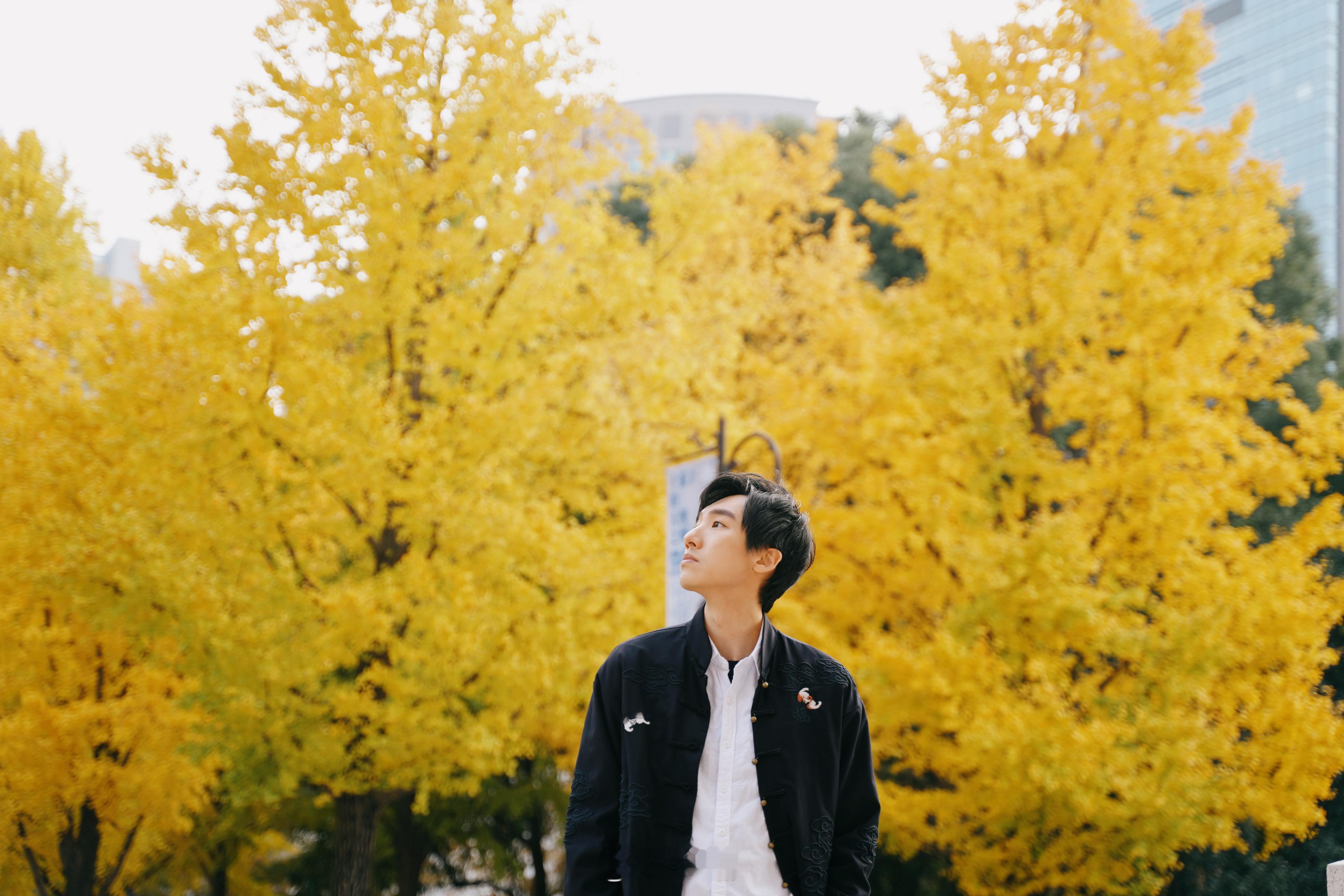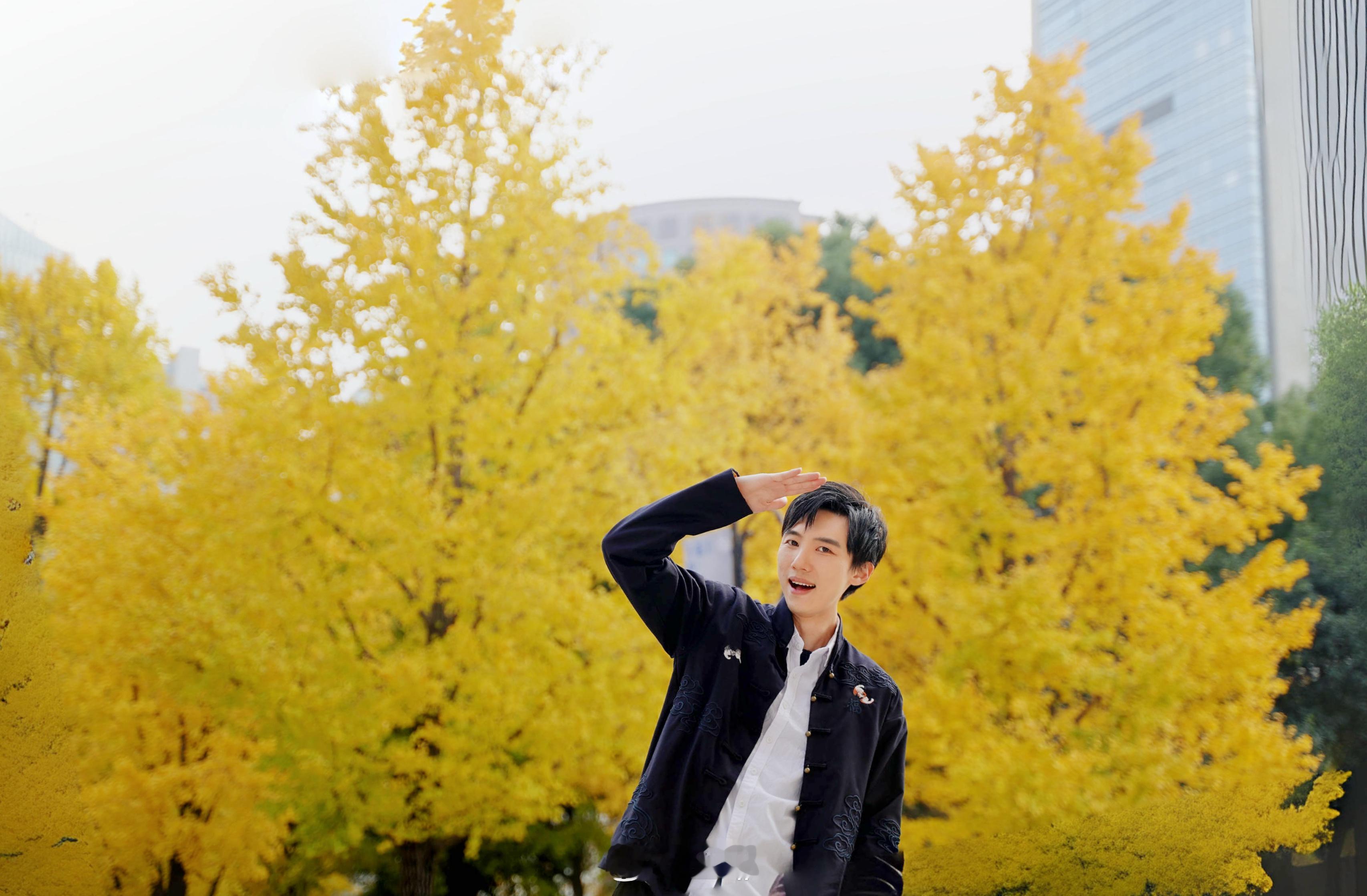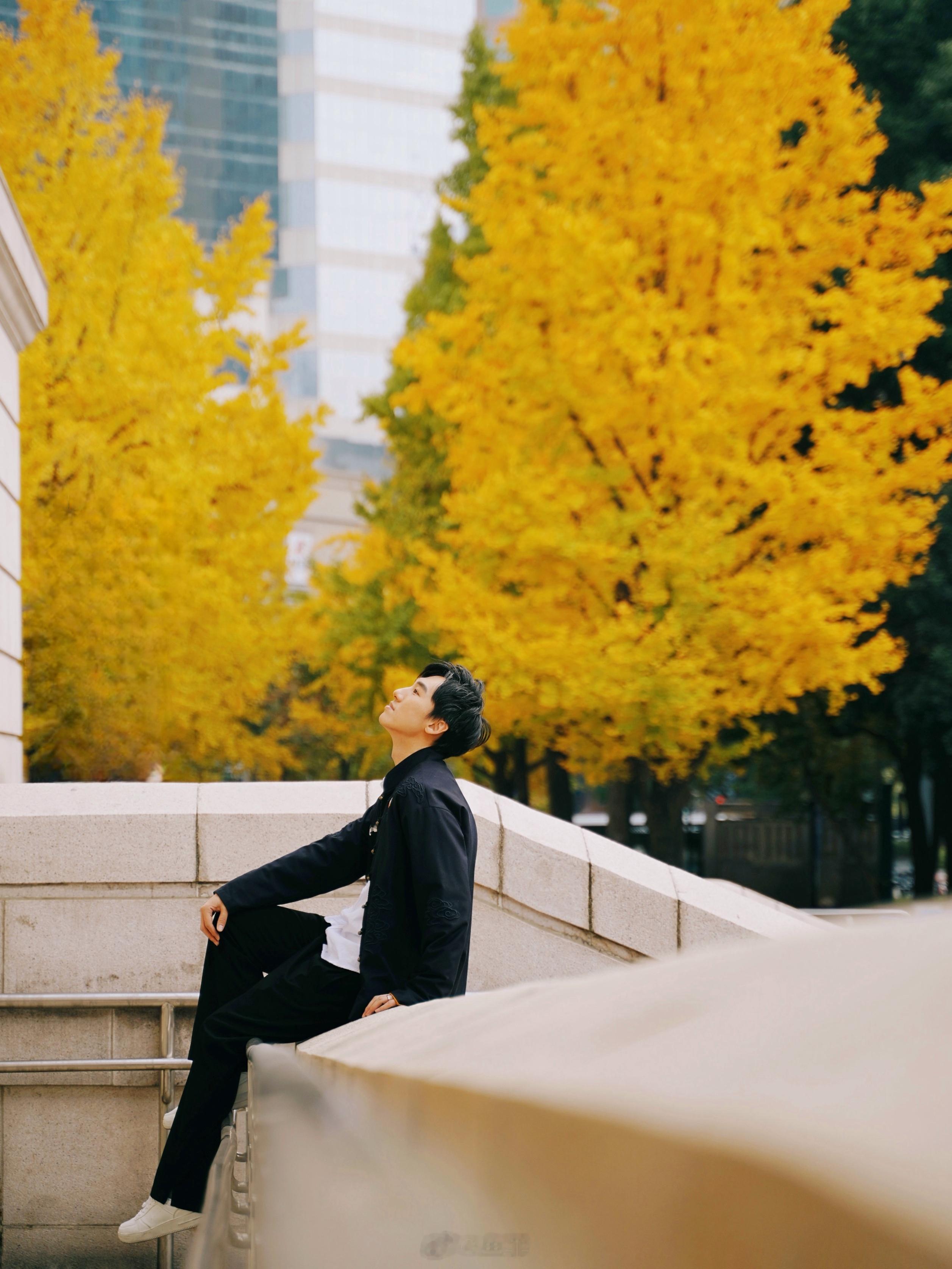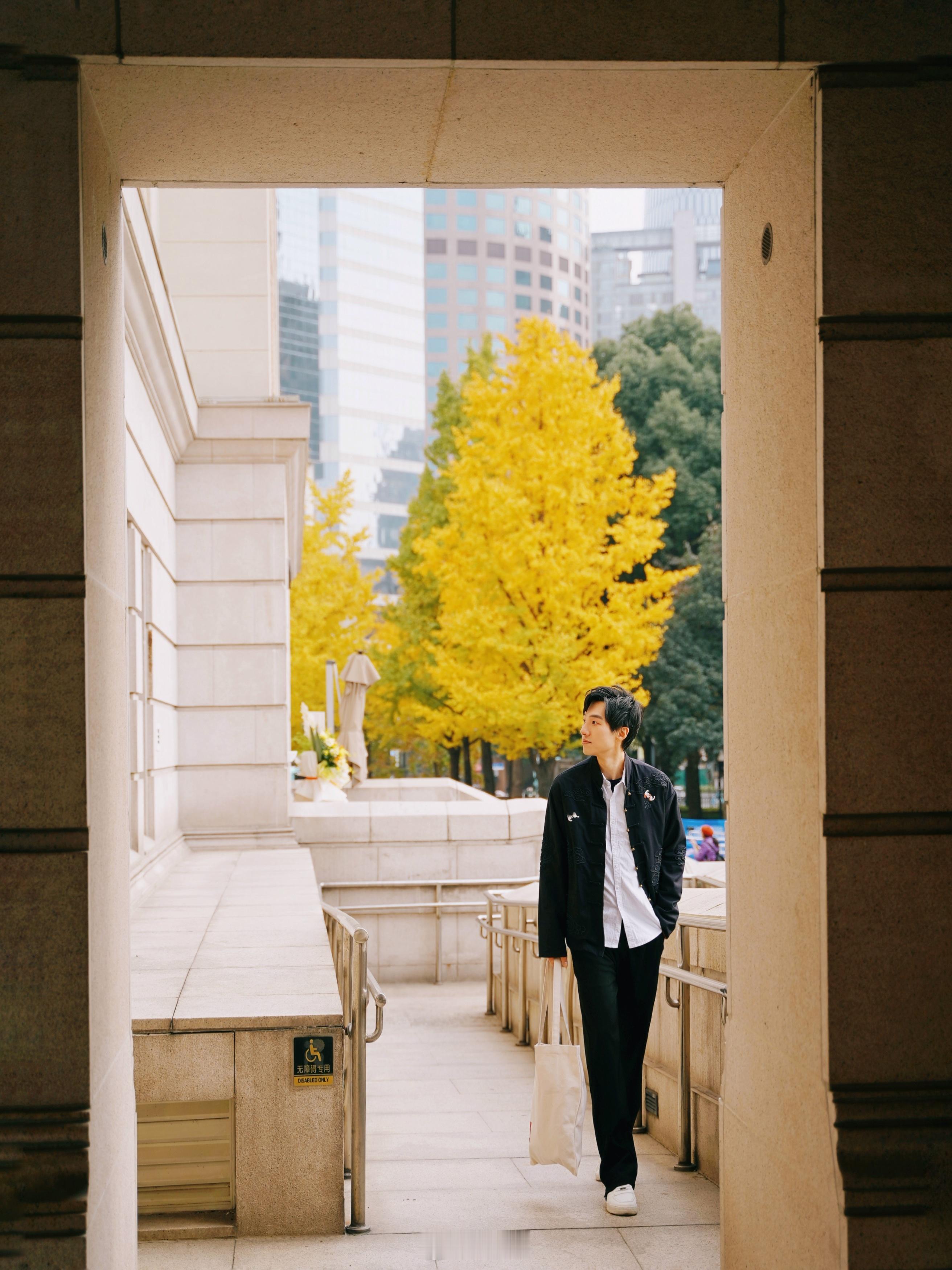1.银杏树对面音乐厅台阶,20号指示牌旁边,摄影师蹲下来仰拍,模特半身出镜,下面的蓝色围栏千万不要入镜