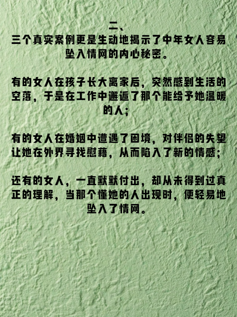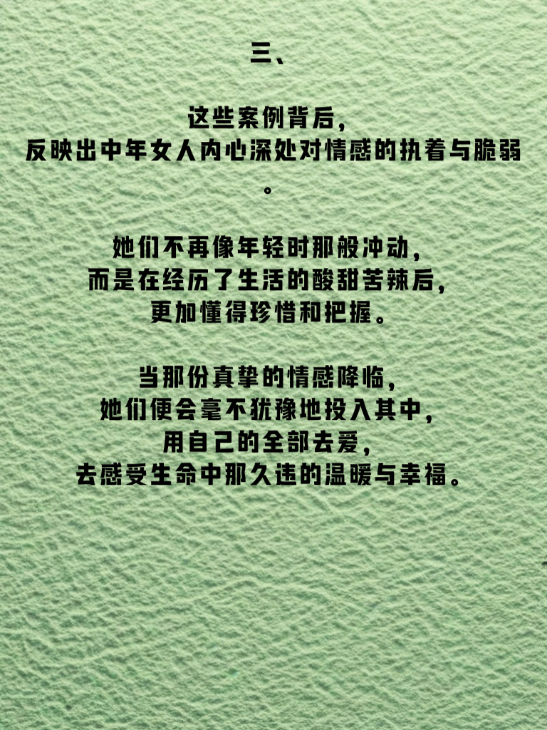 一、中年女人在经历了岁月的洗礼后,内心往往更加渴望被爱与关怀。生活的琐碎和时光的流逝,让她们对情感的需求愈发强烈。就像那久旱的土地渴望甘霖,中年女人的心灵也在等待着一份真挚的情感来滋润。 二、三个真实案例更是生动地揭示了中年女人容易坠入情网的内心秘密。有的女人在孩子长大离家后,突然感到生活的空落,于是在工作中邂逅了那个能给予她温暖的人;有的女人在婚姻中遭遇了困境,对伴侣的失望让她在外界寻找慰藉,从而陷入了新的情感;还有的女人,一直默默付出,却从未得到过真正的理解,当那个懂她的人出现时,便轻易地坠入了情网。 三、这些案例背后,反映出中年女人内心深处对情感的执着与脆弱。她们不再像年轻时那般冲动,而是在经历了生活的酸甜苦辣后,更加懂得珍惜和把握。当那份真挚的情感降临,她们便会毫不犹豫地投入其中,用自己的全部去爱,去感受生命中那久违的温暖与幸福。