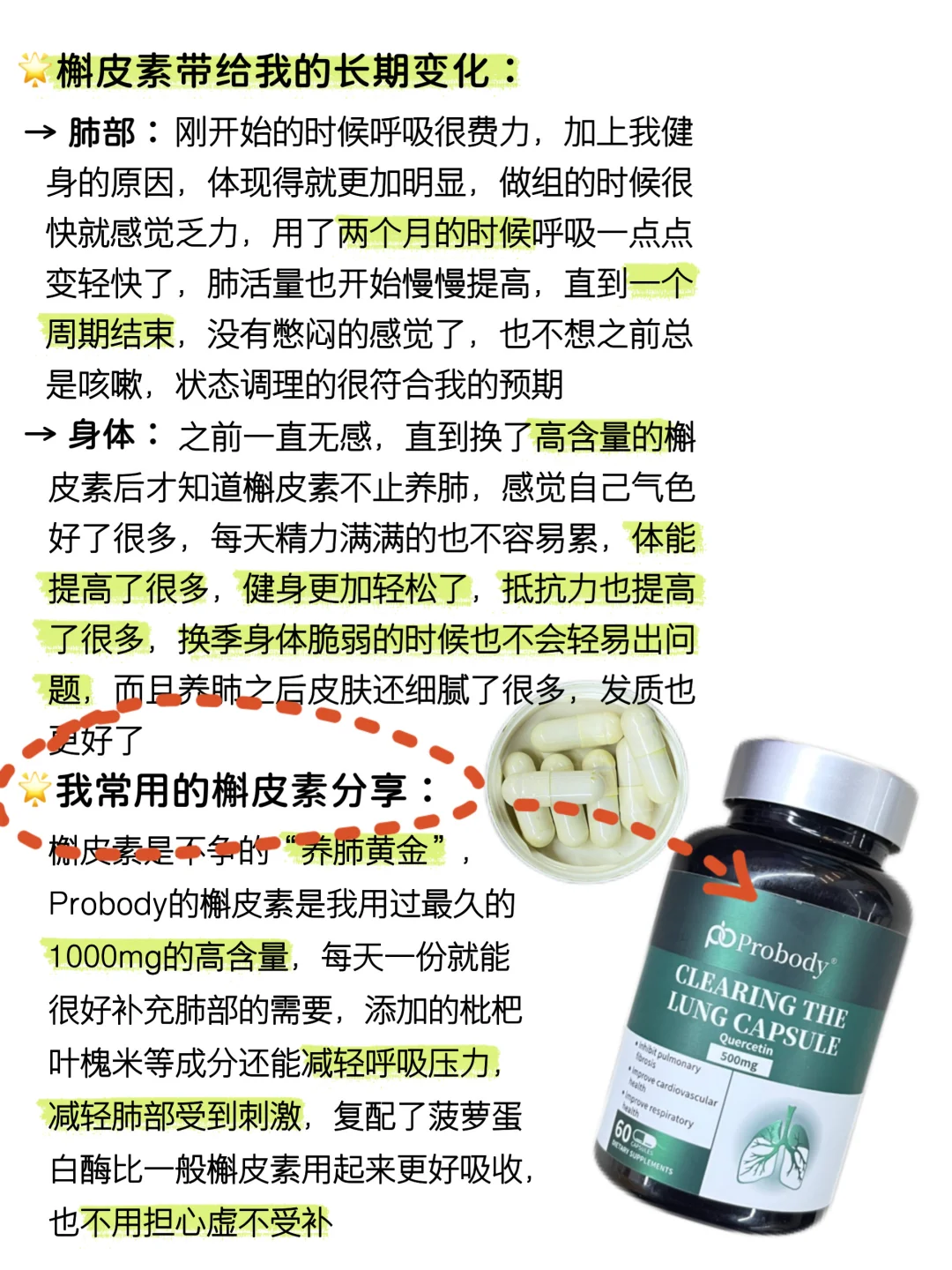 三十岁之后身体就开始逐渐走下坡路了,因为我平时健身的习惯,对身体的变化就更敏感,呼吸费力,还时不时咳嗽,健身的时候明显感觉肺活量不够,做什么事都没精力,这时候就是补肺的重要阶段,Probody的槲皮素是我用过最久的肺部补剂,1000mg的高含量,每天一份就能很好补充肺部的需要,添加的枇杷叶槐米等成分还能减轻呼吸压力,减轻肺部受到刺激,复配了菠萝蛋白酶比一般槲皮素用起来更好吸收,也不用担心虚不受补