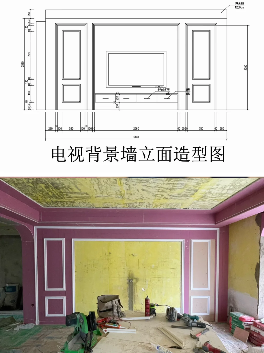 🏠我家背景墙长5米,中间留2米8,两边均分,设计60mmpu线,隐形门用石膏板打造,门的高度比正常的门高度高