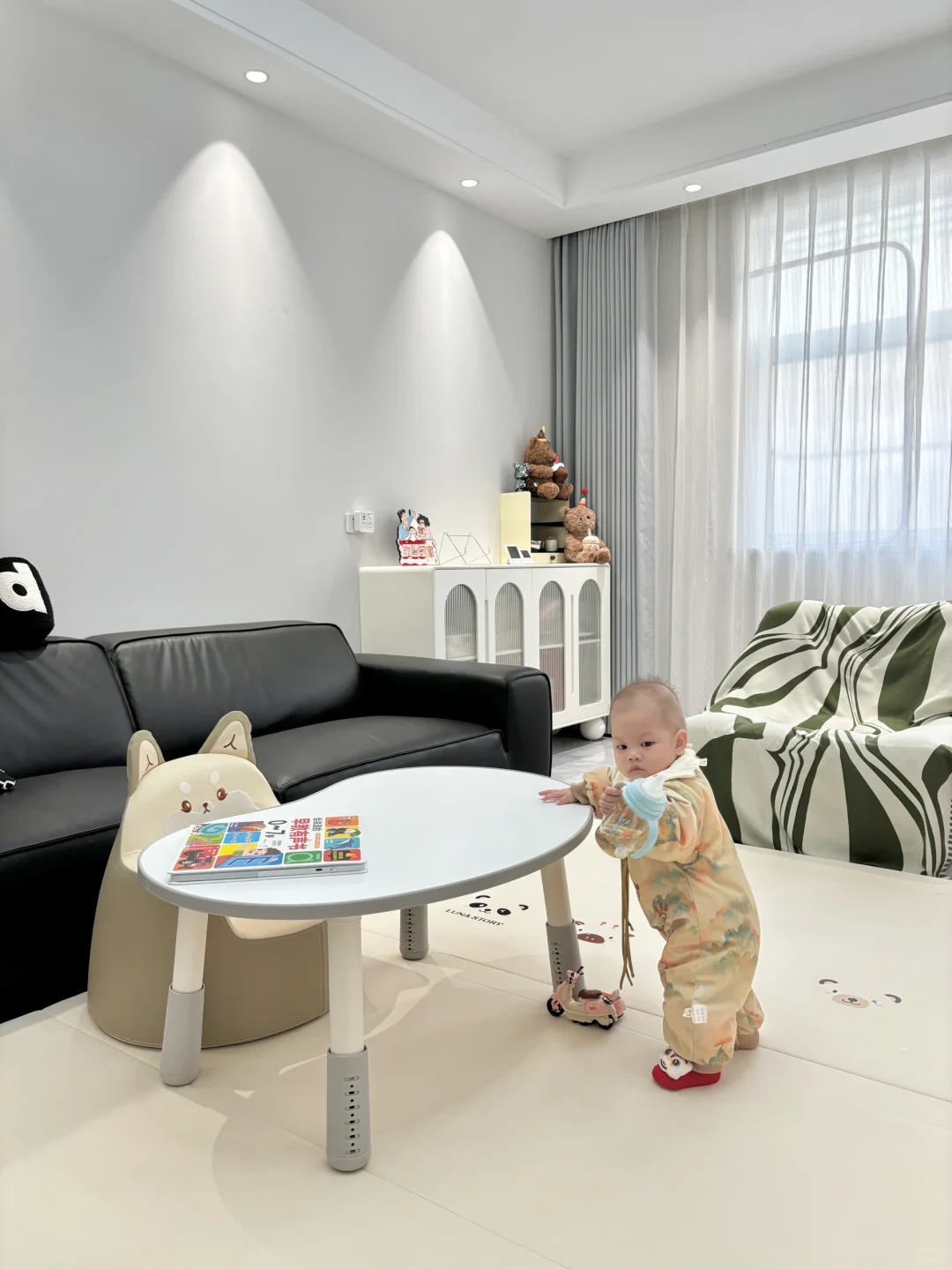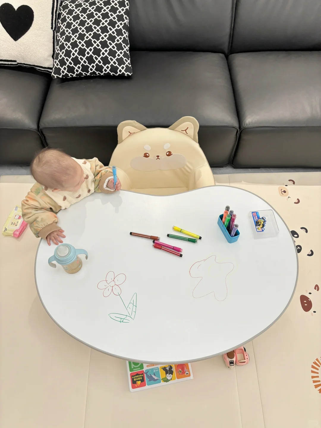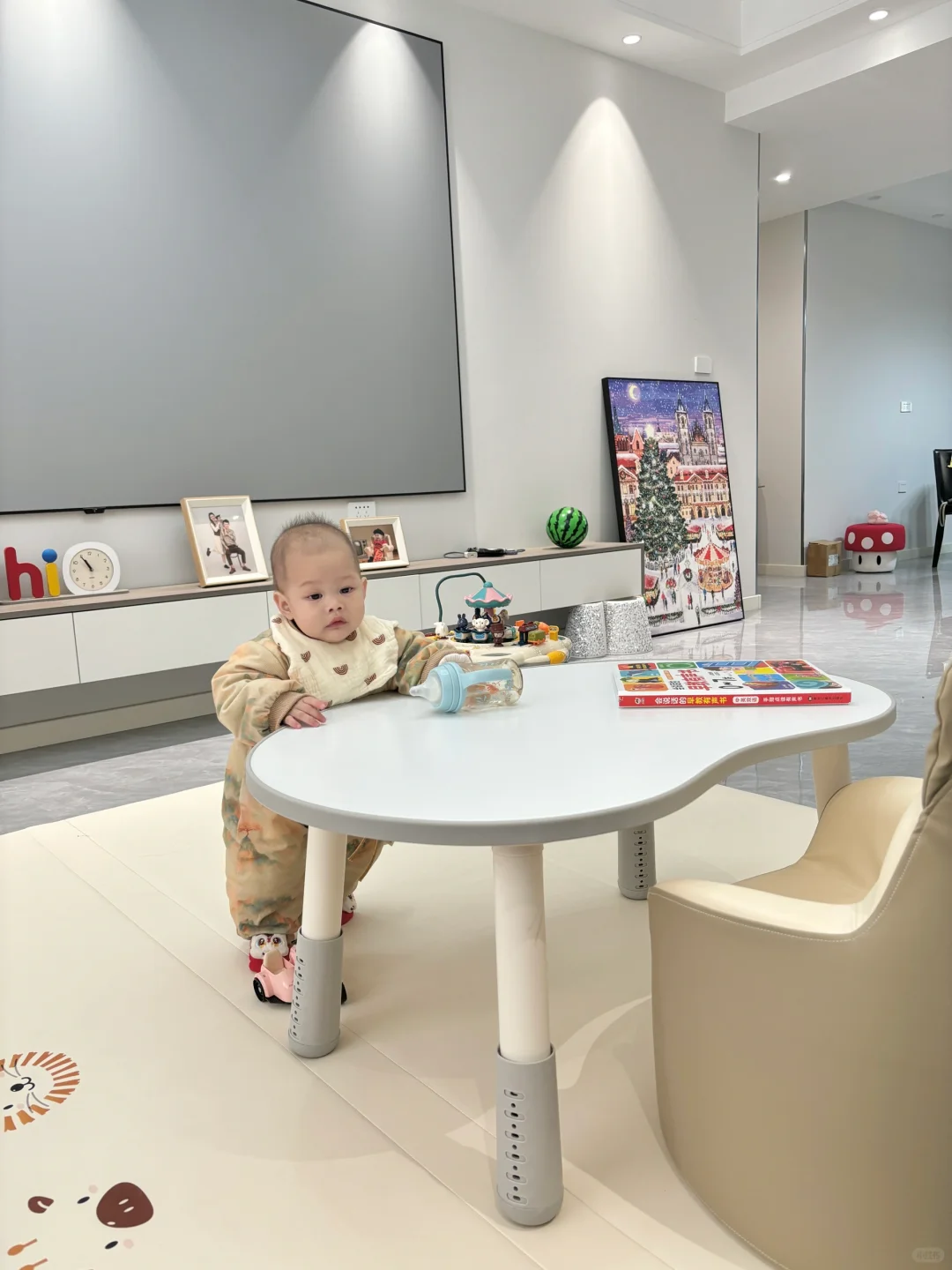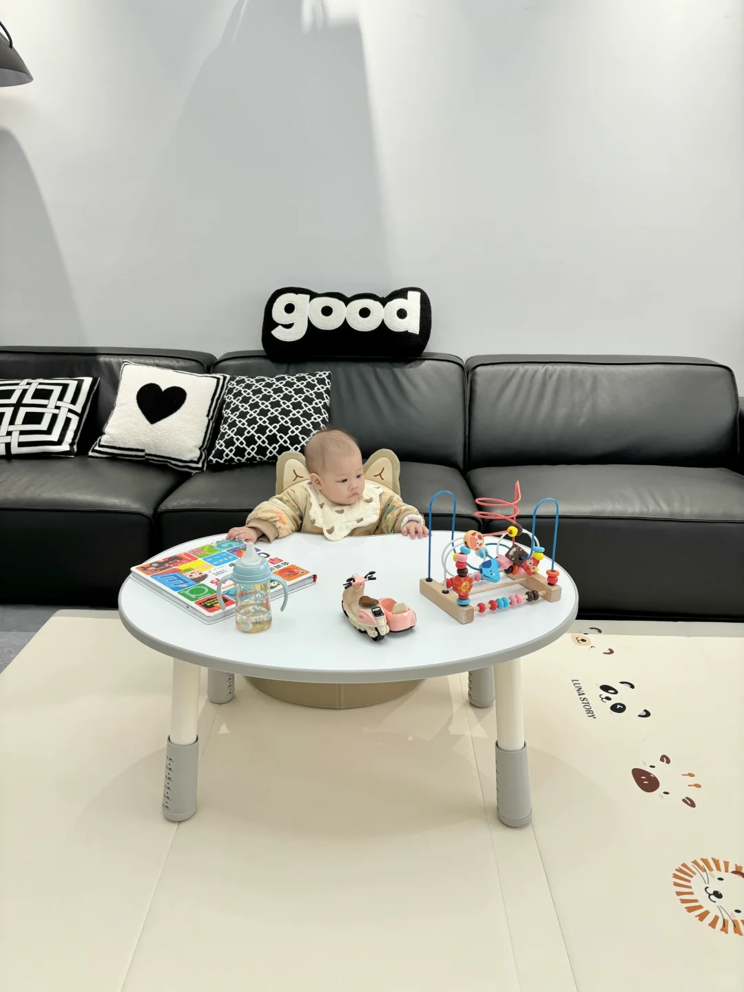真羡慕我女鹅,才八个月就拥有了属于自己的沙发和花生桌,扶站,沿着桌边学走路,渴了自己喝水,站一会累了我就抱她坐沙发上玩玩具,听有声书她已经半小时没理我了… 解放双手啊!!!这个乐婴坊花生桌的桌面居然还可以画画,湿巾一擦就掉了,孩子释放天性,想涂就涂想画就画,不会因为在桌子上涂画就挨骂,该说不说,这也不花啥大钱,百来块能用好几年,带加高柱,等上小学写作业可以安装上,现在小月龄就常规高度很合适