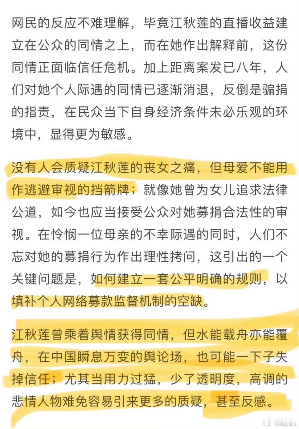没有人会质疑江秋莲的丧女之痛,但母爱不能用作逃避审视的挡箭牌;就像她曾为女儿追求法律公道,如今也应当接受公众对她募捐合法性的审视。