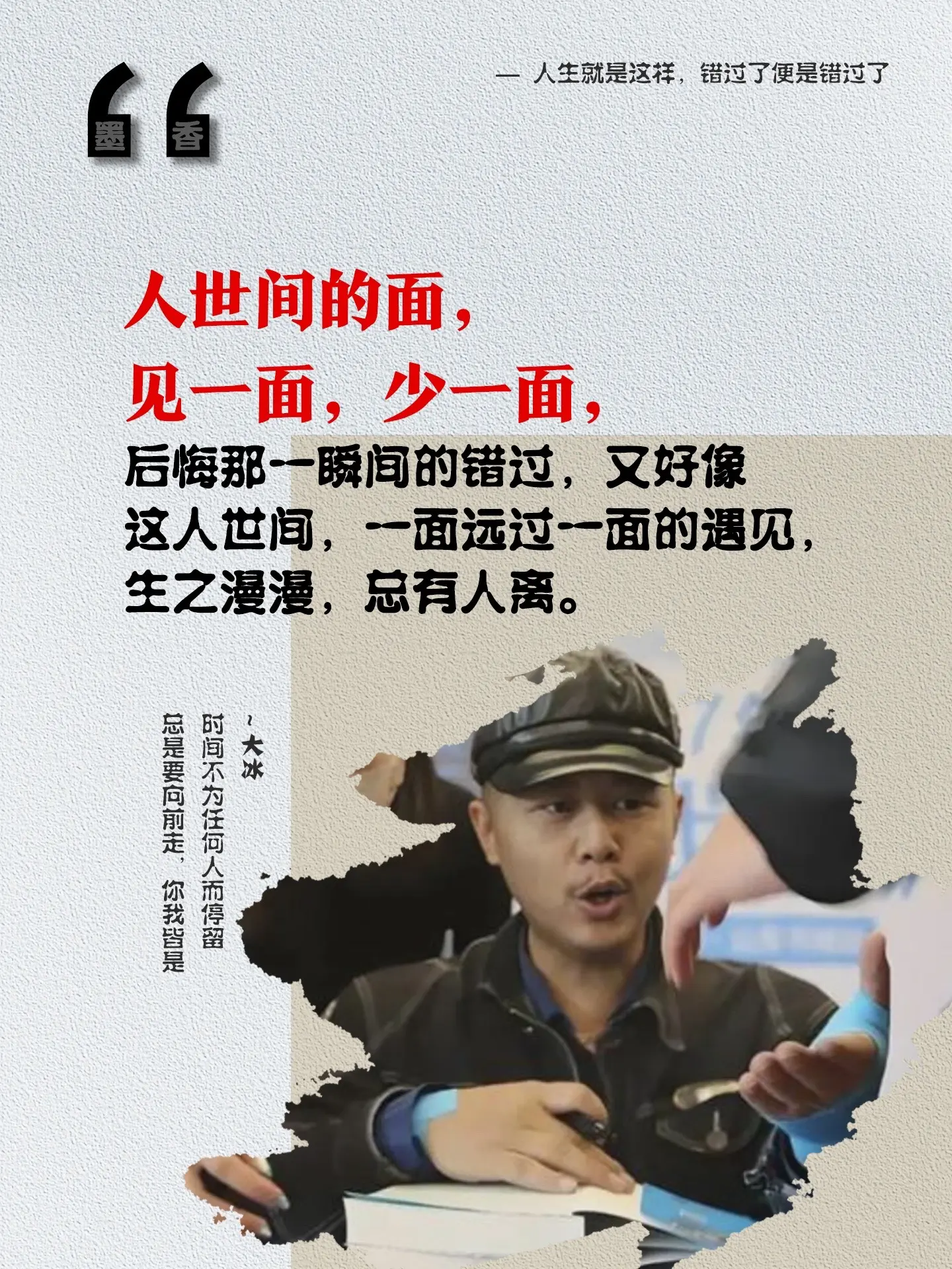 来自大冰老师的经典语录,总有一句温暖你的心!少年,你为何好胜又懒惰?你一定要有所失,才能有所悟吗?没有能力只有臆想在臆想中给自己营造一种个人英雄主义情怀,最终除了虚空什么也得不到。也许登上一座山,又望见更高的山,人畏难便易自困但殊不知行走的过程每一步都足矣丰盈此生。人世间的面见一面,少一面,后悔那一瞬间的错过,又好像这人世间,一面远过一面的遇见,生之漫漫,总有人离。难过的时候别憋着,要学会释放自己,这是大冰老师给所有读者的叮咛!