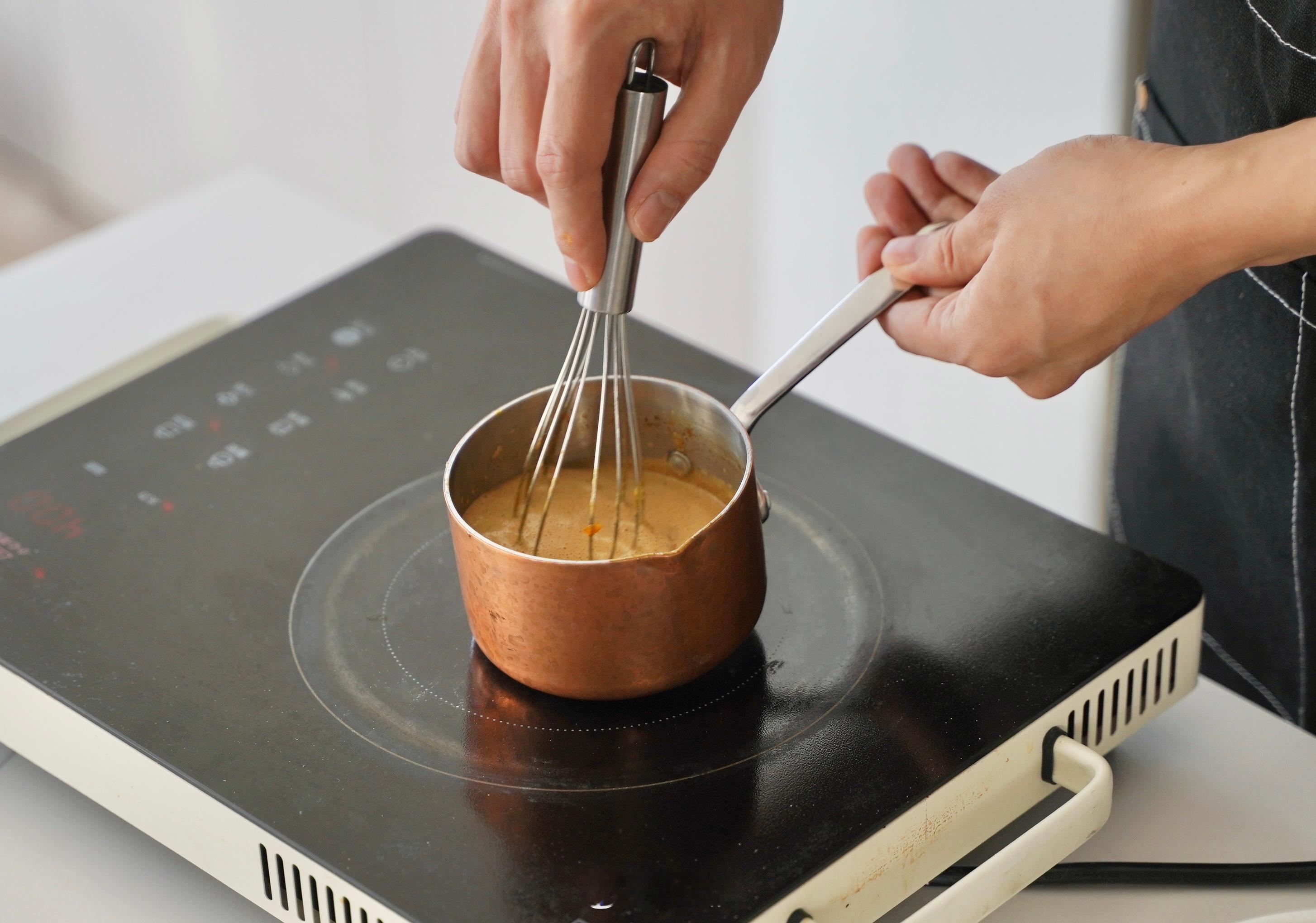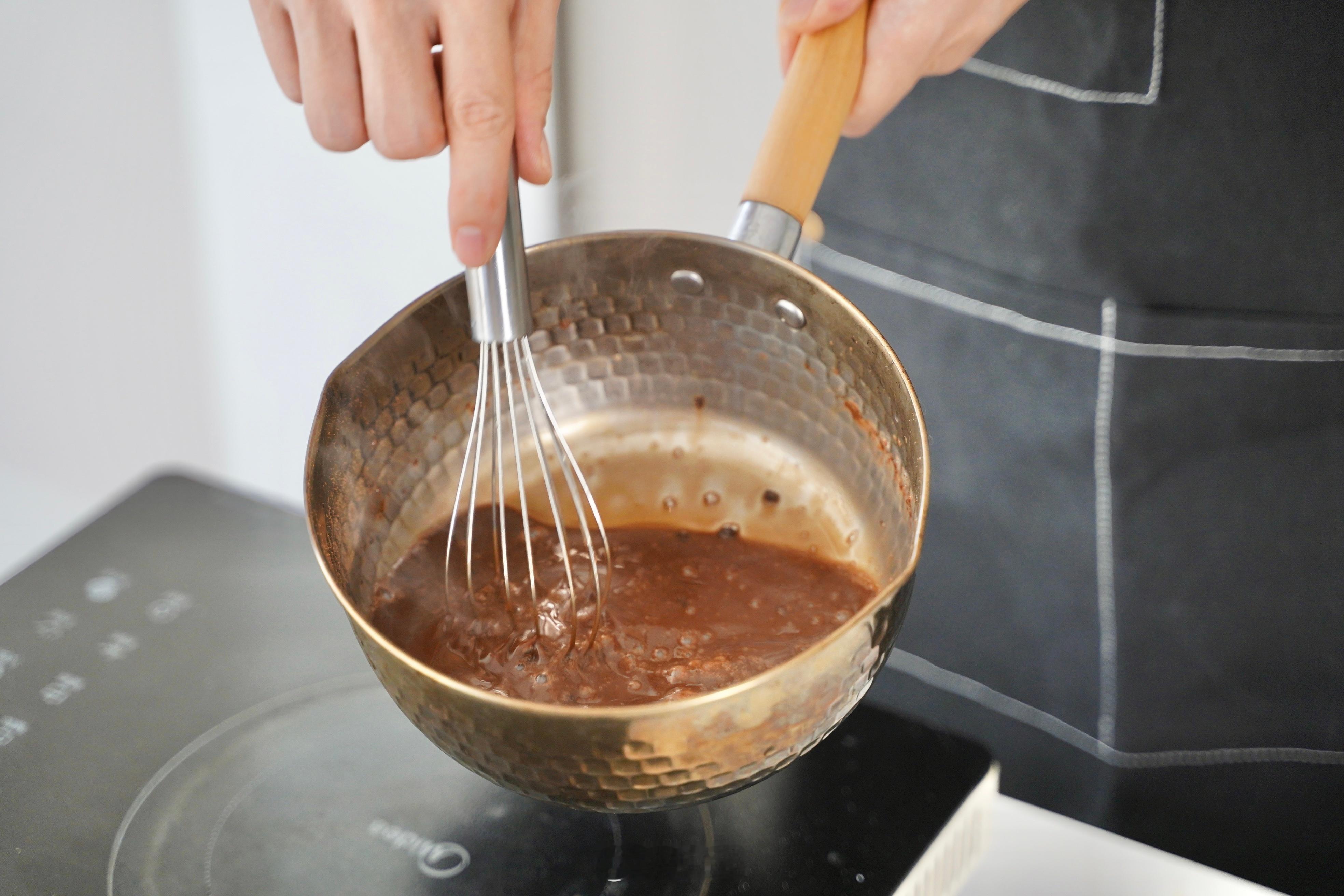 2、 水和奶油混合煮开,倒入可可粉与白糖,搅拌均匀后中小火煮两分钟