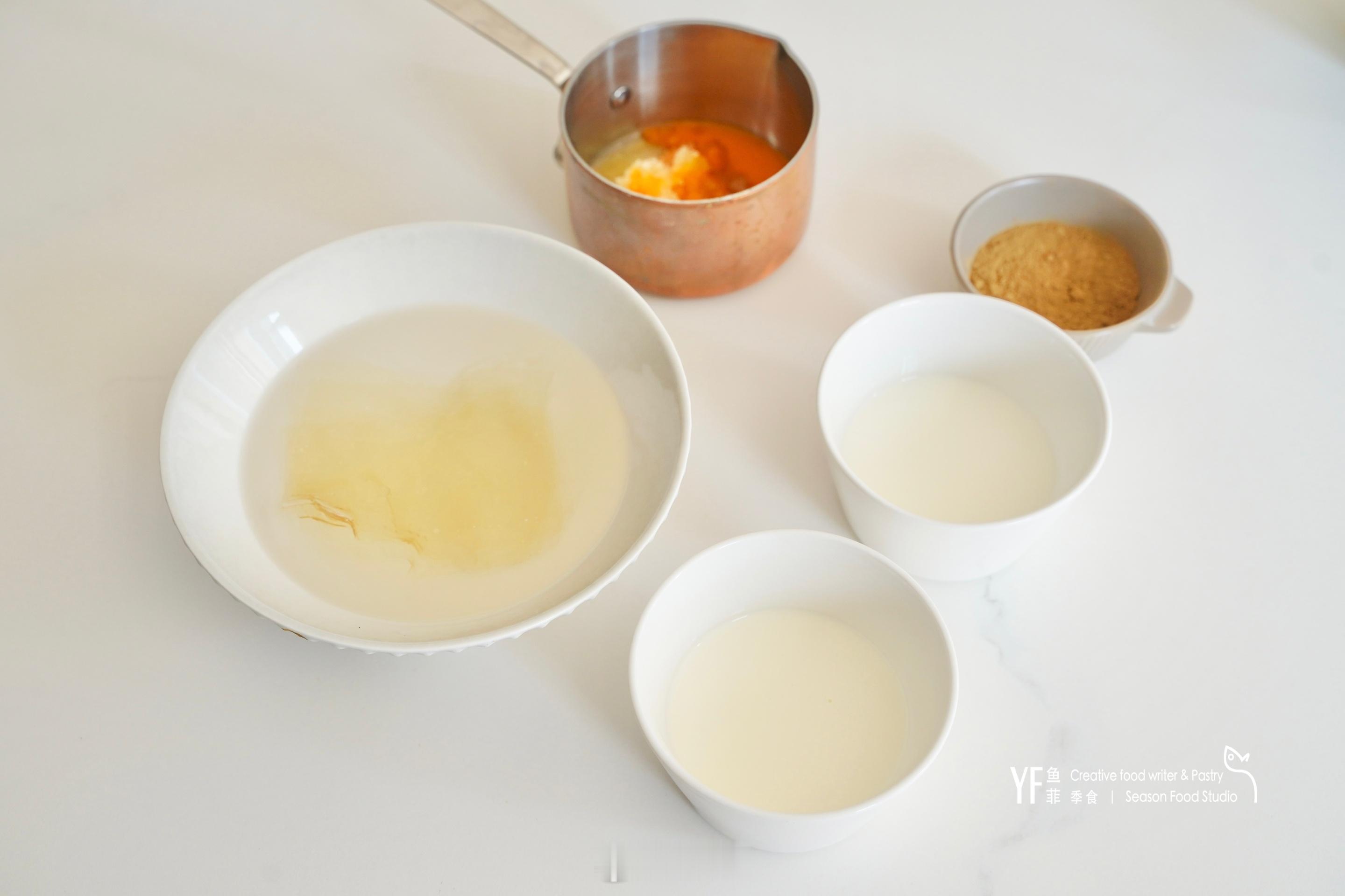 3、 关火加入吉利丁片搅拌至融化,再倒入葡萄糖搅拌均匀即可