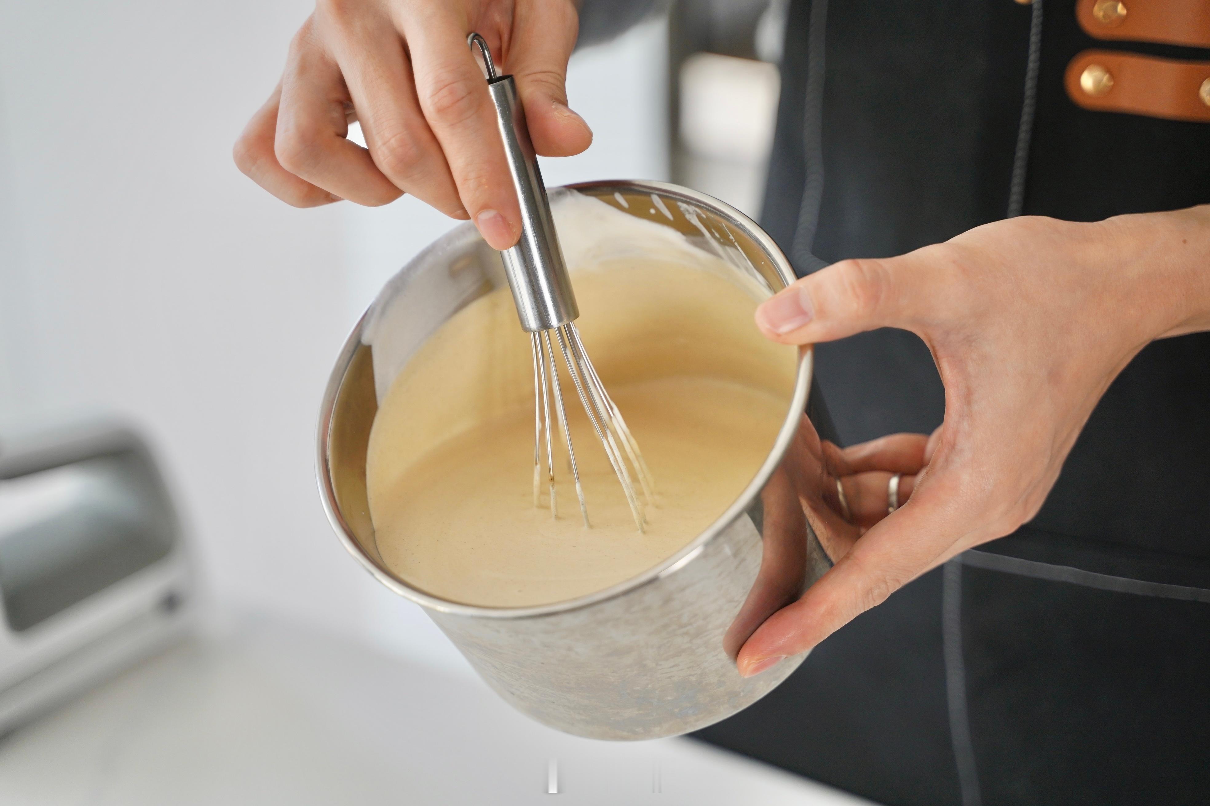 3.虽然要确保法国奶油充分混合,但避免过度搅拌,以免过多引入空气,影响奶油的稳定性。