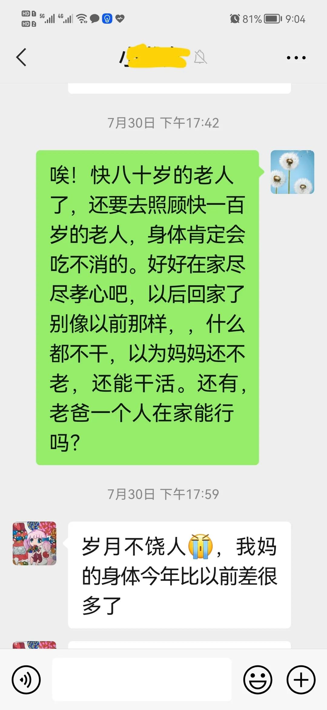 弟媳回湖南参加外甥的婚礼,本来一星期左右就应该来杭州了。过了十几天还没回来,我联系了一下她,才知道是她妈妈生病住院了。 她妈妈今年79岁,是照顾她98岁的外婆累倒的。 她妈妈姐妹四个,有一个舅舅英年早逝,最小的四姨也快六十岁了。 四姐妹一个星期轮一次。她老妈去时,就得把她老爸一个人放在家,老爸80多了,身体也不好。 弟媳在杭州,孩子要上学。俩姐姐,一个看孙子孙女,一个儿媳刚生完孩子。没人能替她妈妈去照顾外婆。 她外婆躺在床上十几年了,以前还好点,大小便能自理了。现在一不注意,就会把屎弄得到处都是。 气得她四姨说,妈妈,你怎么还不死啊。 她外婆说,我不想死啊! 家有一老,如有一宝。对于普通老百姓来讲,很难!更谈不上“老吾老,以及人之老”了。