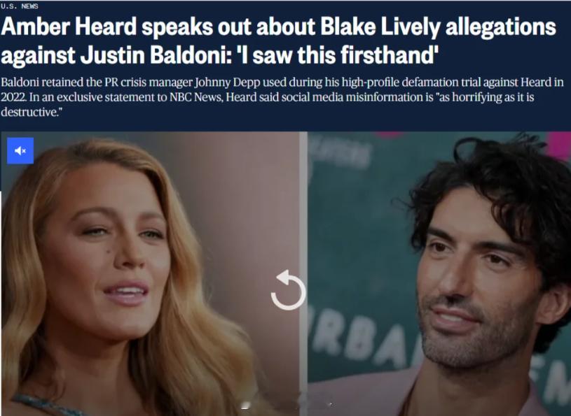 安柏·赫德(Amber Heard)在回应布蕾克·莱弗利(Blake Lively)对她的《爱在旋转时》(“It Ends With Us”)联合主演贾斯汀·巴尔多尼(Justin Baldoni)的指控时表示,社交媒体是“谎言变成真相的地方”。赫德周一接受NBC新闻采访时表示,她“亲眼目睹了这一切”。
