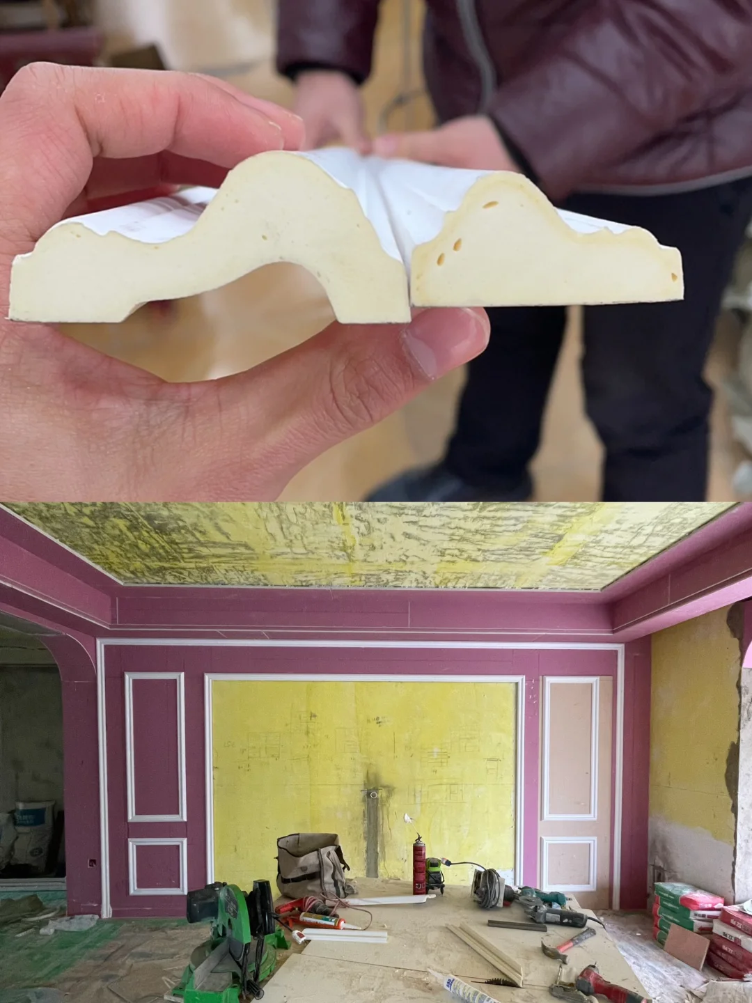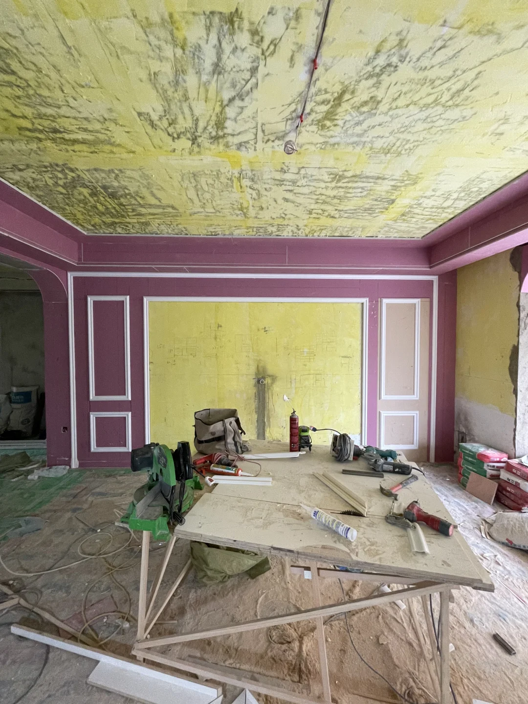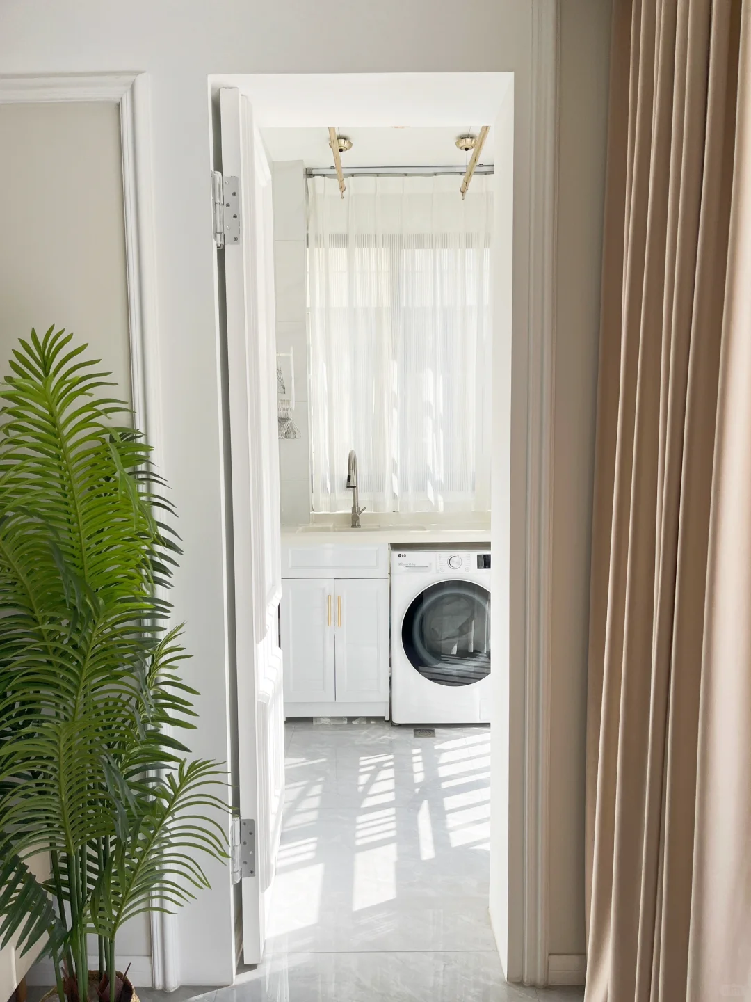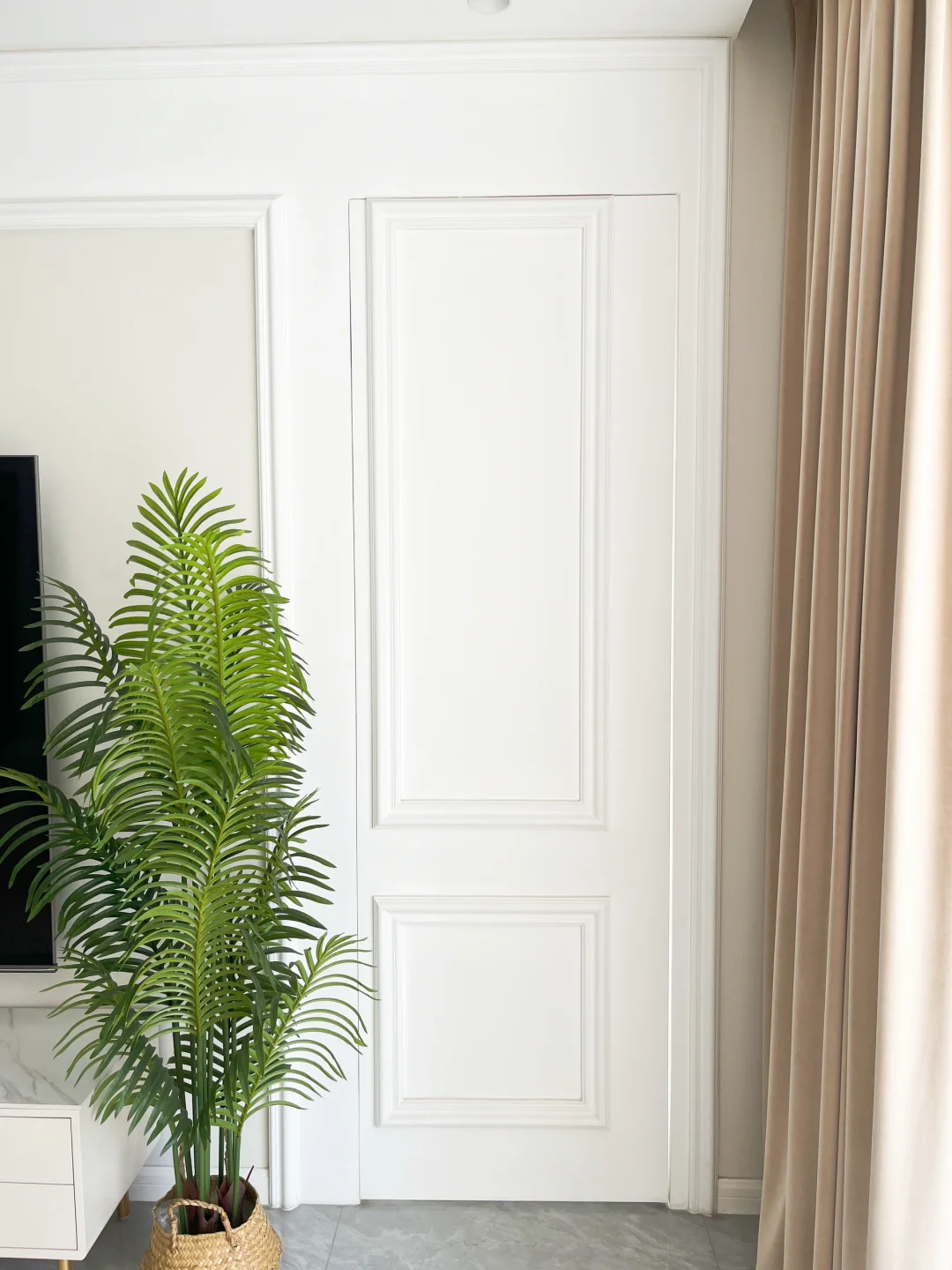 你家这么干净衣服晾哪里? 我说在电视背景墙后面!做了一个晾晒区! 🏠我家背景墙长5米,中间留2米8,两边均分,设计60mmpu线,隐形门用石膏板打造,门的高度比正常的门高度高