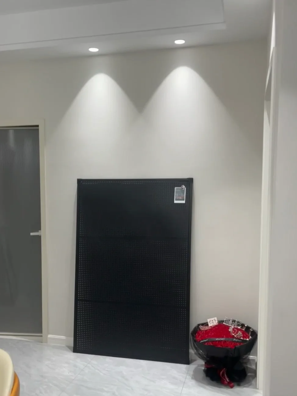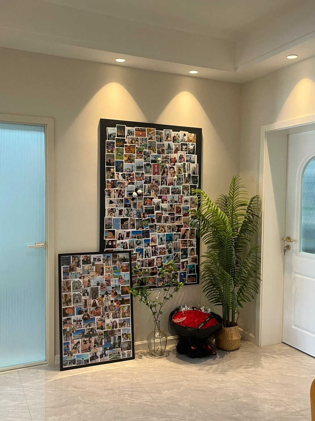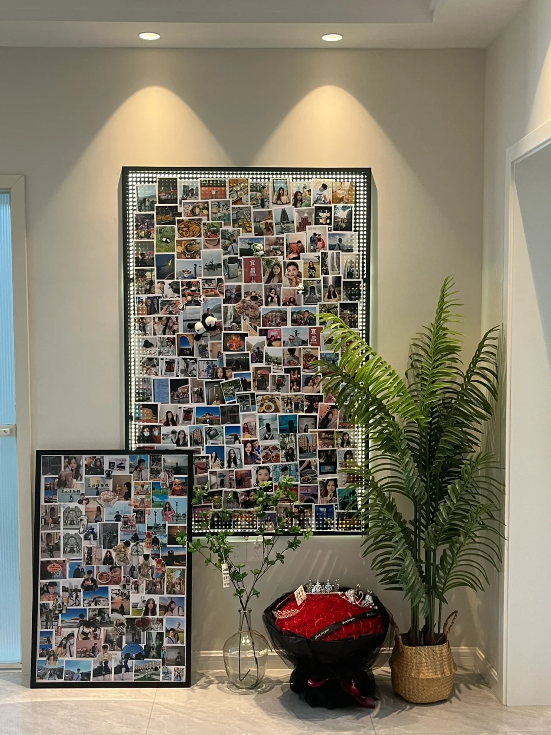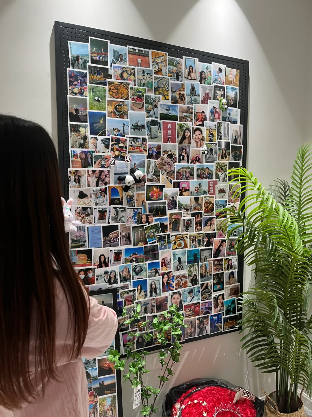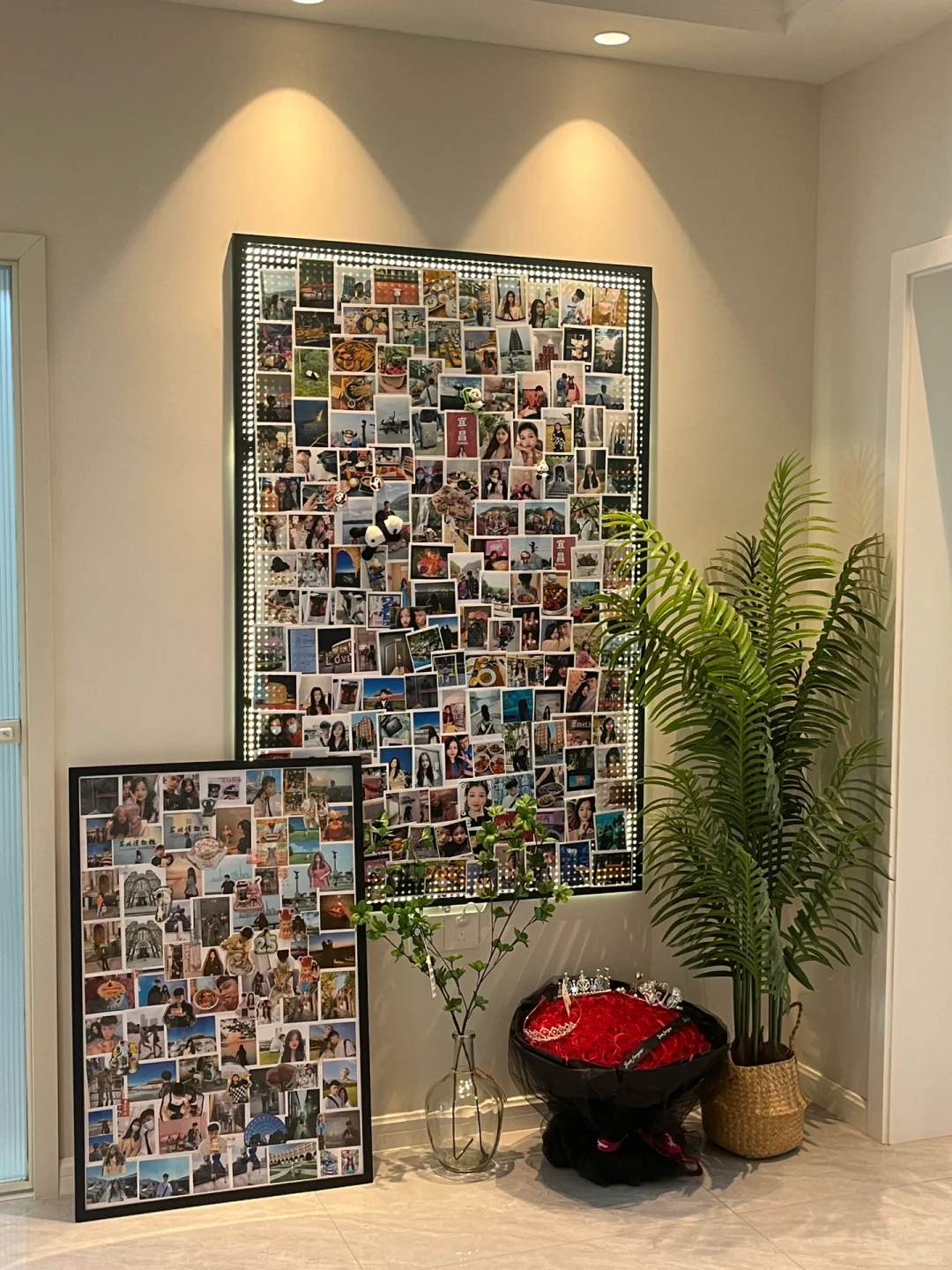 照片打印出来更有意义 📸来抄作业吧 现在终于实现了!我真的太喜欢我的照片墙了!! 记录幸福真是一件太美好的事情了~~~~ 用料:100×150黑色洞洞板一个,灯带,变压器,感应开关,磁条贴,5寸照片一堆 没什么窍门,就是用心,很简单!