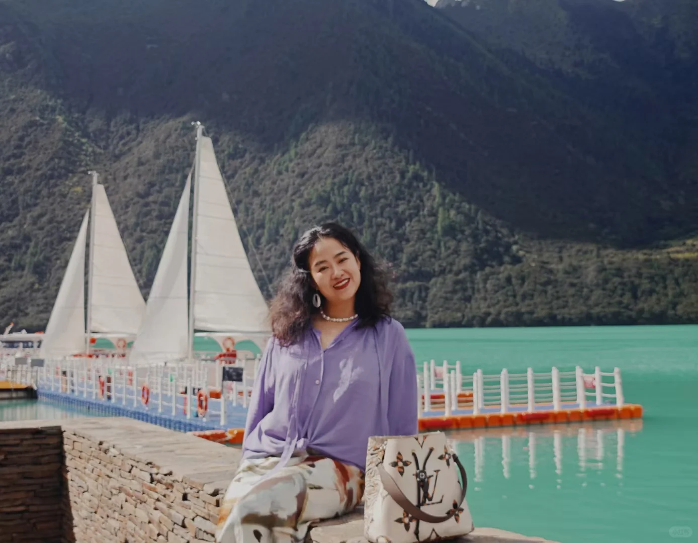 风拂柳,粉樱绽放,我身着浅粉蕾丝旗袍,立于古栏之下。长袖轻笼,盘髻缀珠,耳坠摇曳