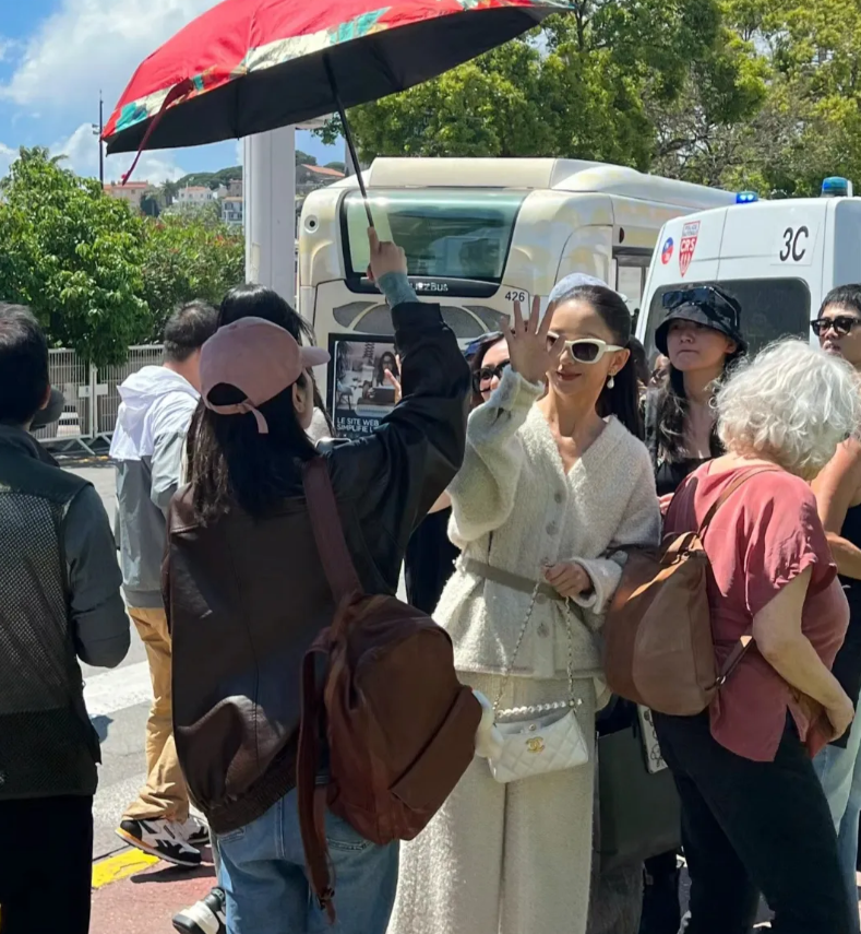 戛纳偶遇佟丽娅,本人果然跟普通人有壁,脸巨小气质特别好,一对小梨涡笑起来甜甜的,40岁了依苗条年轻,就是皮肤有点儿黑。