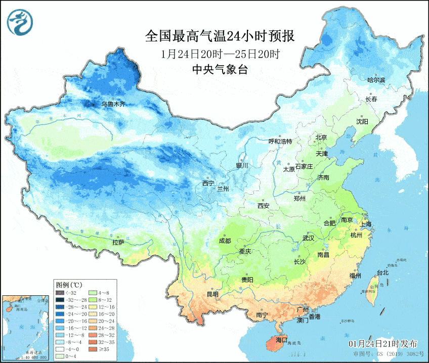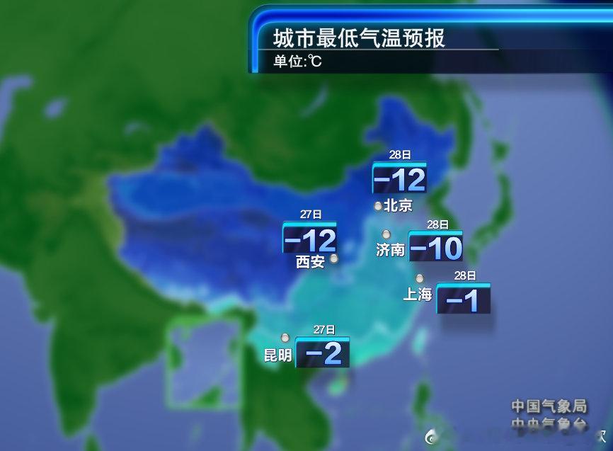 另外27-28日多地最低气温将降至本轮寒潮最低点,部分城市气温会创今冬新低(℃):西宁-20、银川-19、太原-17、北京-12℃、西安-12、济南-10、昆明-2、上海-1、重庆3、南宁5。
