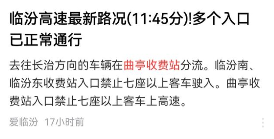 再说一句,开车上路一定要绝对相信高德导航。 比如高德导航显示的这个路线,该路线从高速公路上跑着跑着突然要求你下高速,然后再从同样一个口上高速。 不明白的人会觉得云里雾里,认为是高德导航出现了问题,但实际上这就是导航带给你的最佳方案。 这段路是临汾高速公路当时的路况是在中午11:45左右去往长治方向的车辆必须要在曲亭收费站分流,因为当时该路段是没办法正常通行的,那时已经禁止了七座以上的客车驶路。 而高德导航就是凭借大数据看到了这一点,并且给出了最佳的解决方案,这就是高德地图的智能化。 但是我是绝对相信导航的,我用高德的办法就是导航刚规划完,我会扫一下全图,只要发现没有大范围的绕路,就会一直跟着导航走。 如果发现大范围绕路,就会放大地图看看,或者手动选别的路线,最终发现别的路线就是一条红线。