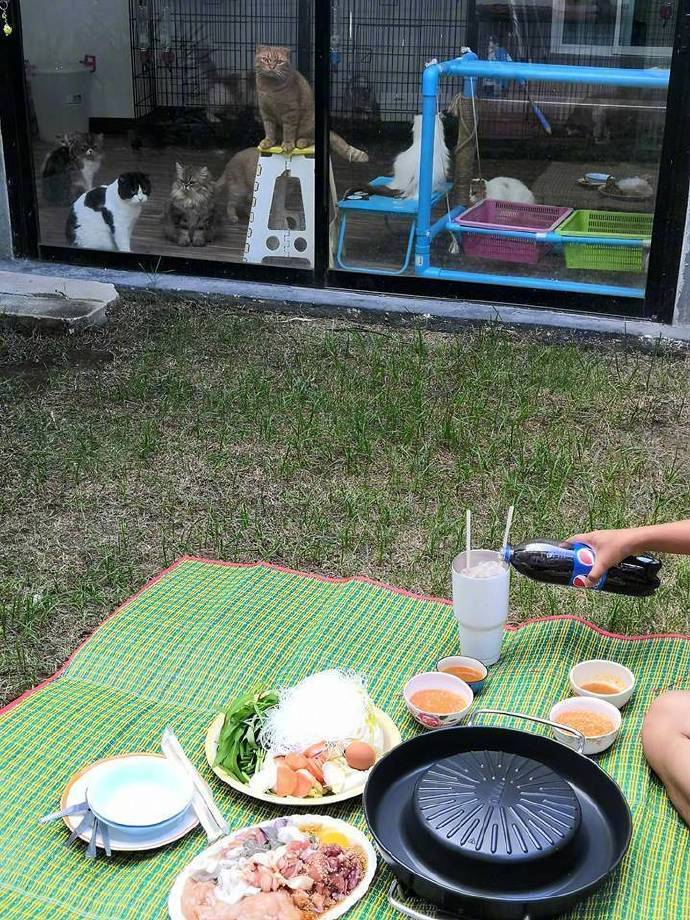 主人在院子里加餐怕猫咪干扰就把门都关住了...[喵喵]