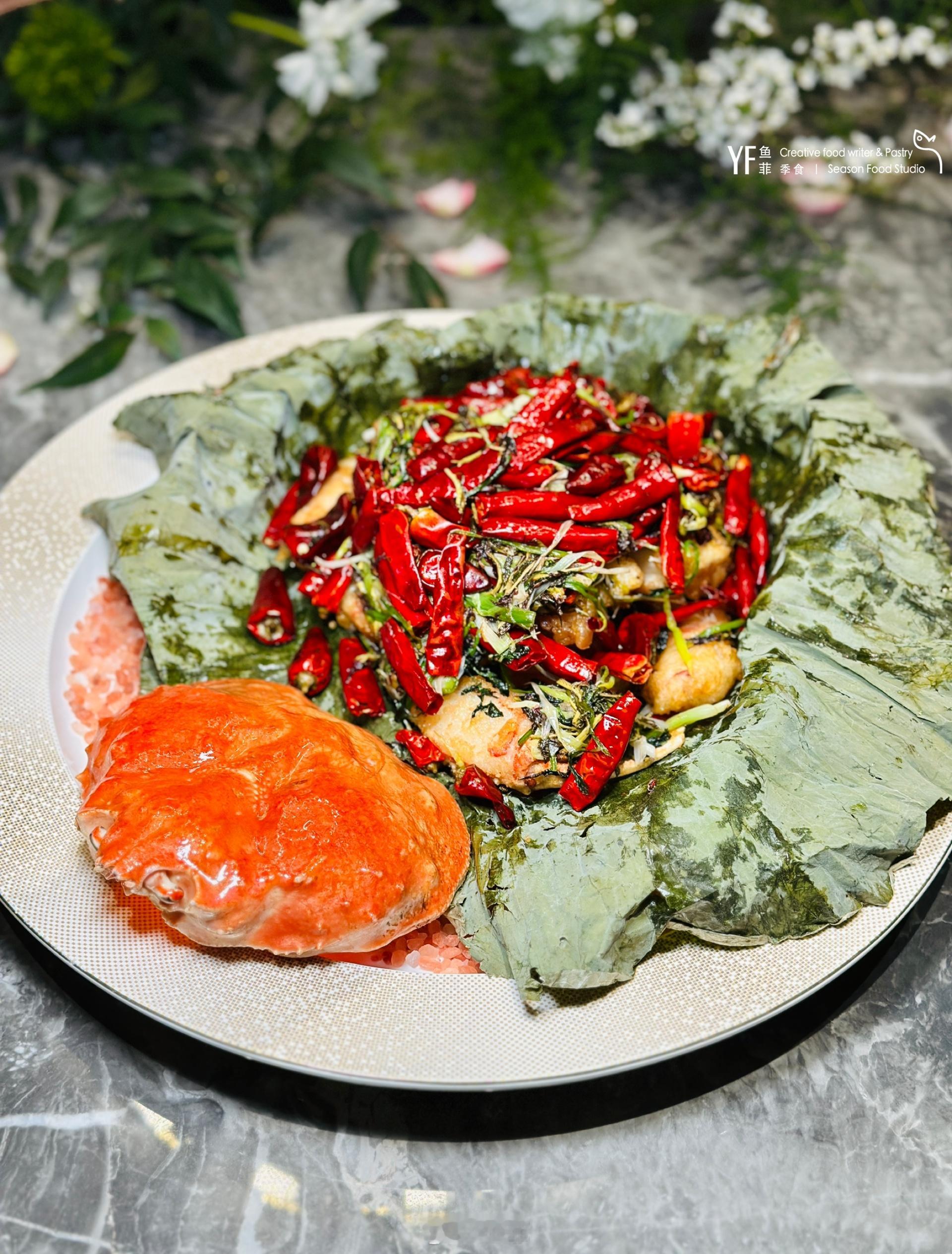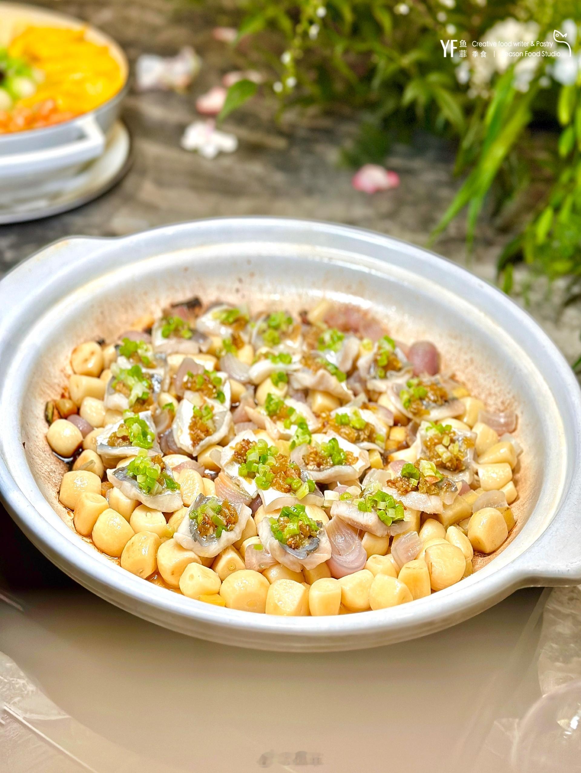 🐟蒜子乔葱焗鲳鱼掀盖时,蒜香如海风扑面。银鲳卧在焦香的蒜子上,顶部的剁椒氤氲着辣韵,层次丰富。