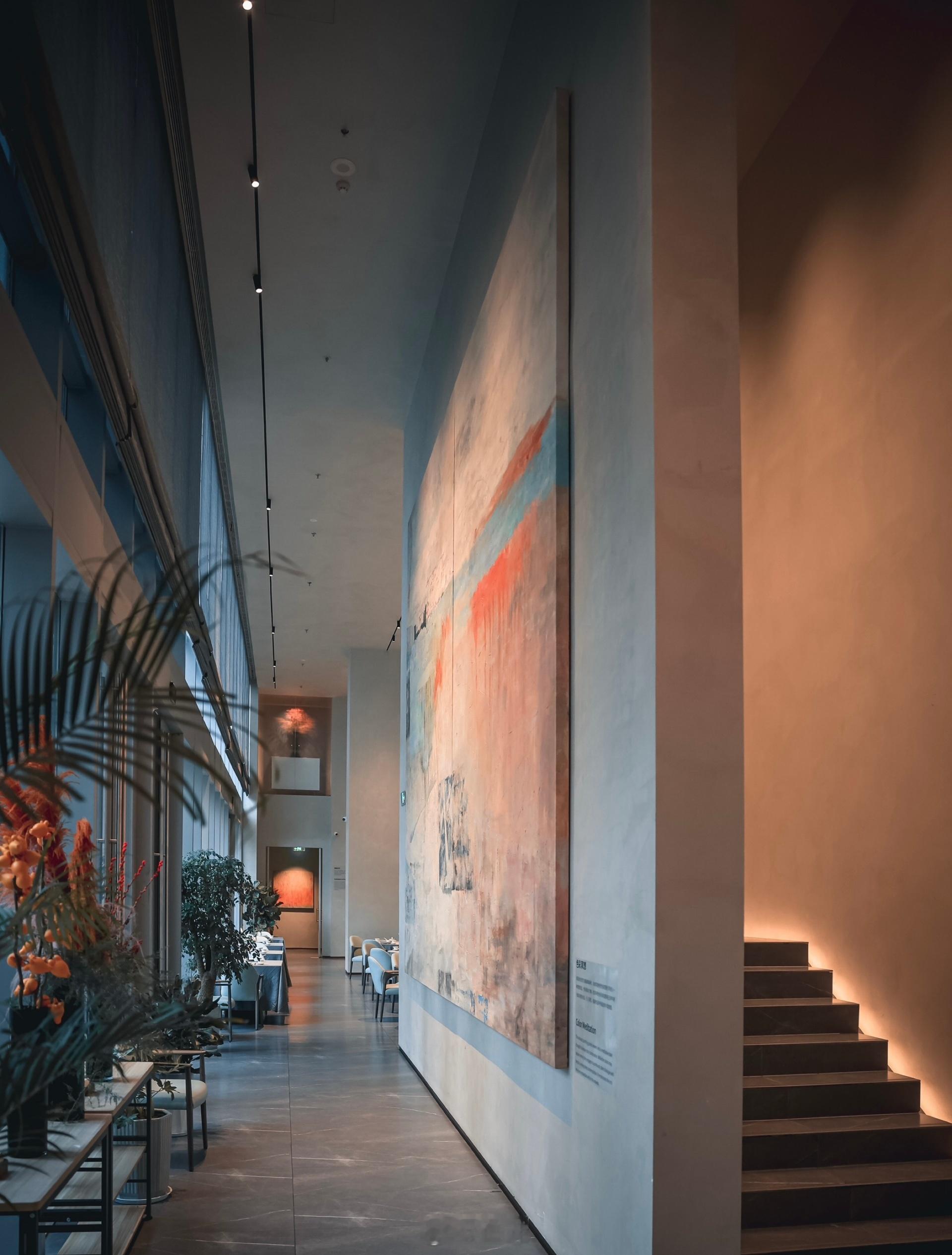 推门见画,翠竹掩映的笔触在画框上写意流淌。山形花铺自在玄关处,赤色光影,将光晕或映的日出东方,或悬空留白。颇有行至山腰转角处,忽见青檐半弦月的意境。