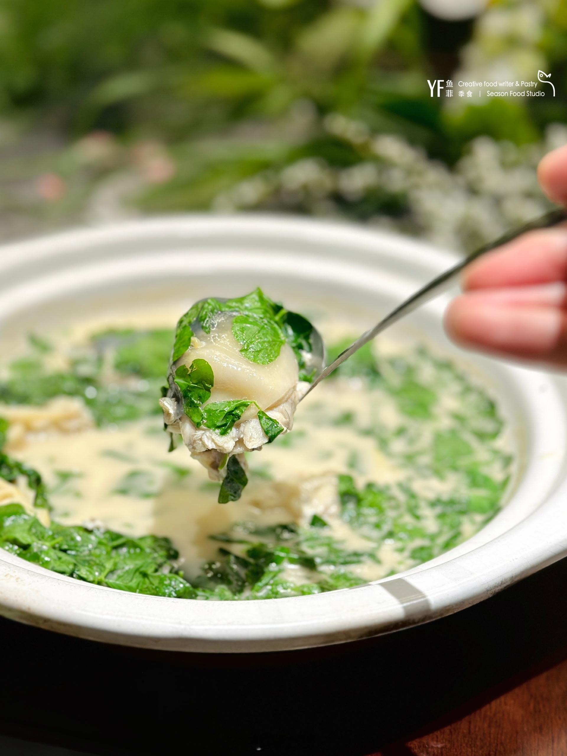 🐚鸡汁荠菜煮河蚌,蚌肉裹着琥珀色的鸡汁,荠菜在汤里舒展如写意水墨。