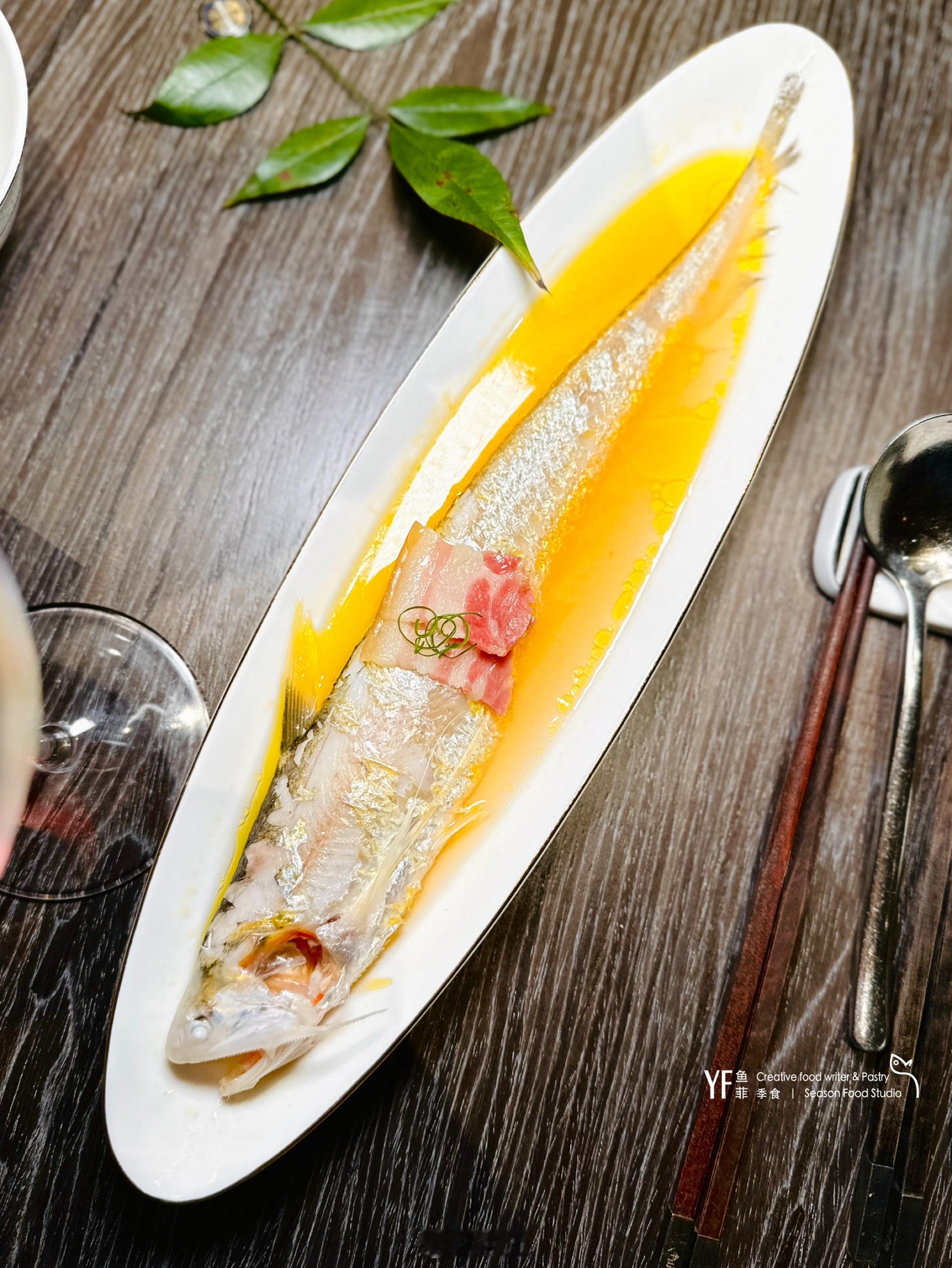 🐟鸡油火腿蒸刀鱼,浅珀色的底汤,银鳞如残雪未消,油润的光泽里浮动着陈年火腿的沉香。恍若看见渔人披着蓑衣在烟波里收网,刀鱼游过春江时,尾巴扫碎了满河星子。