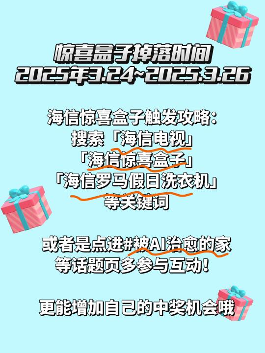 家人们,海信搞大动作啦! 惊喜盒子限时掉落了! 可千万不要错过这次中奖的机会哦! 快来看看你是不是那条锦鲤呢,嘻嘻! - 惊喜盒子掉落时间 2025年3.24~2025.3.26 怎么参与呢,超简单: 搜索「海信」「海信罗马假日洗衣机」等关键词,浏览跳出的相关笔记,就有机会掉落惊喜盒子! 另外想领奖品的家人,还可以点进被AI治愈的家 话题页,多参与互动!