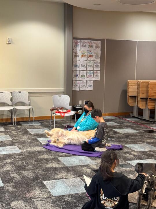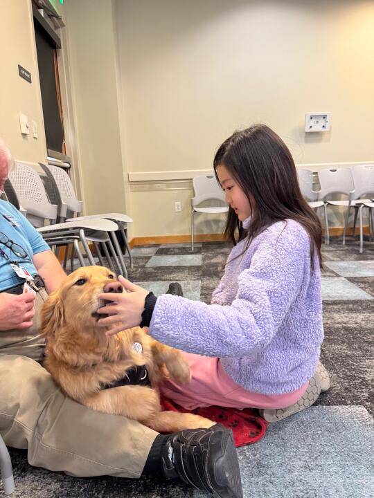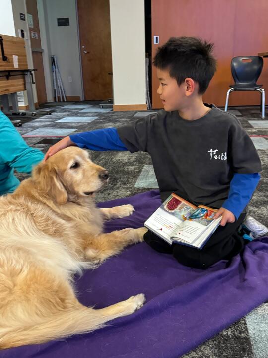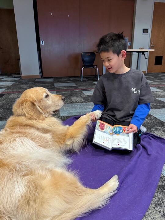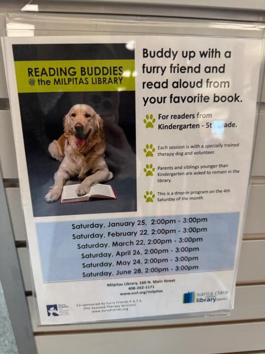 Milpitas图书馆每个月有一次给狗狗读书的活动,不用预约先到先得,俩娃早早去排了队,一共四只狗狗,每次进去四个小孩,给狗子读10分钟的书然后换下一波小孩进去。