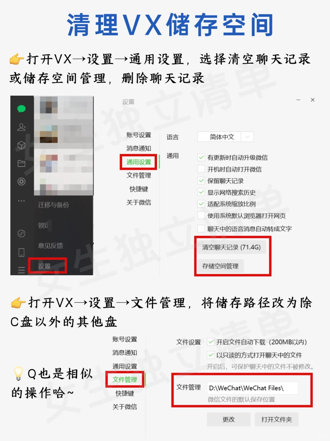 ✔️打开VX→设置→文件管理,将储存路径改为除C盘以外的其他盘